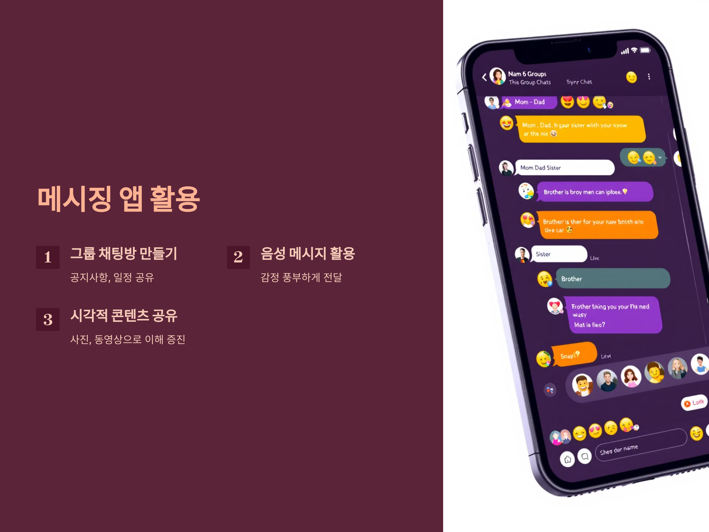 가족 간의 소통에서 가장 기본적이고 중요한 도구는 바로 메시징 앱입니다. 카카오톡, 텔레그램, WhatsApp 등 다양한 메시징 앱은 간단하게 텍스트 메시지, 사진, 동영상을 주고받을 수 있는 강력한 기능을 제공합니다. 하지만 단순히 "안녕하세요?"와 같은 텍스트 메시지만 주고받는 것에서 그치지 않고, 보다 효과적인 소통을 위해 몇 가지 팁을 소개합니다.