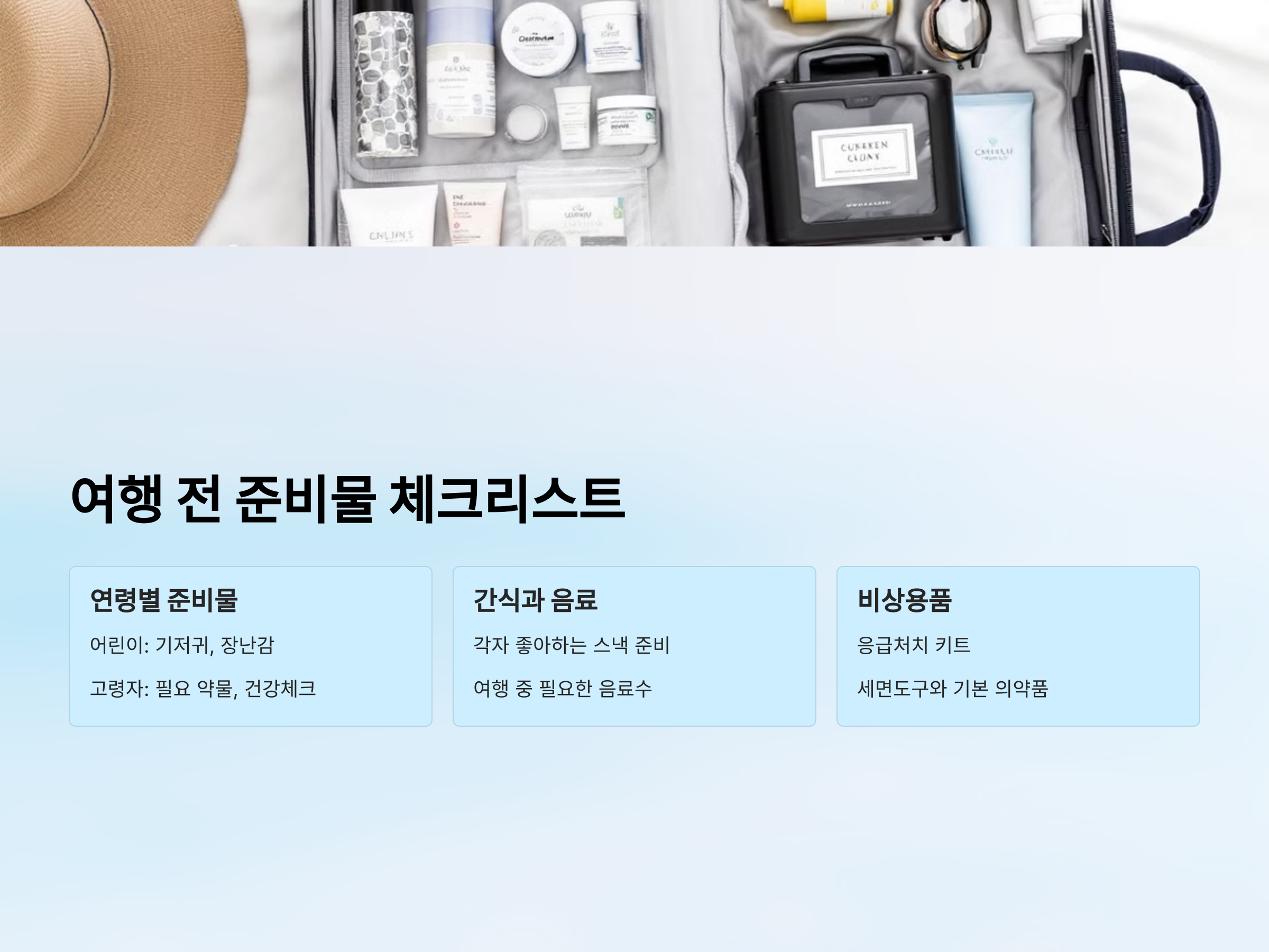 여행의 즐거움을 더하려면 준비물이 빠짐없이 준비되어야 합니다. 가족 여행에서는 여행자 각자의 특성에 맞는 물품을 준비하는 것이 중요합니다. 예를 들어, 어린 자녀가 있다면 기저귀, 아기용 의류, 장난감 등을 준비해야 하고, 고령의 부모님이 동행할 경우 건강 상태를 체크하고 필요한 약물을 준비하는 것이 필요합니다.
