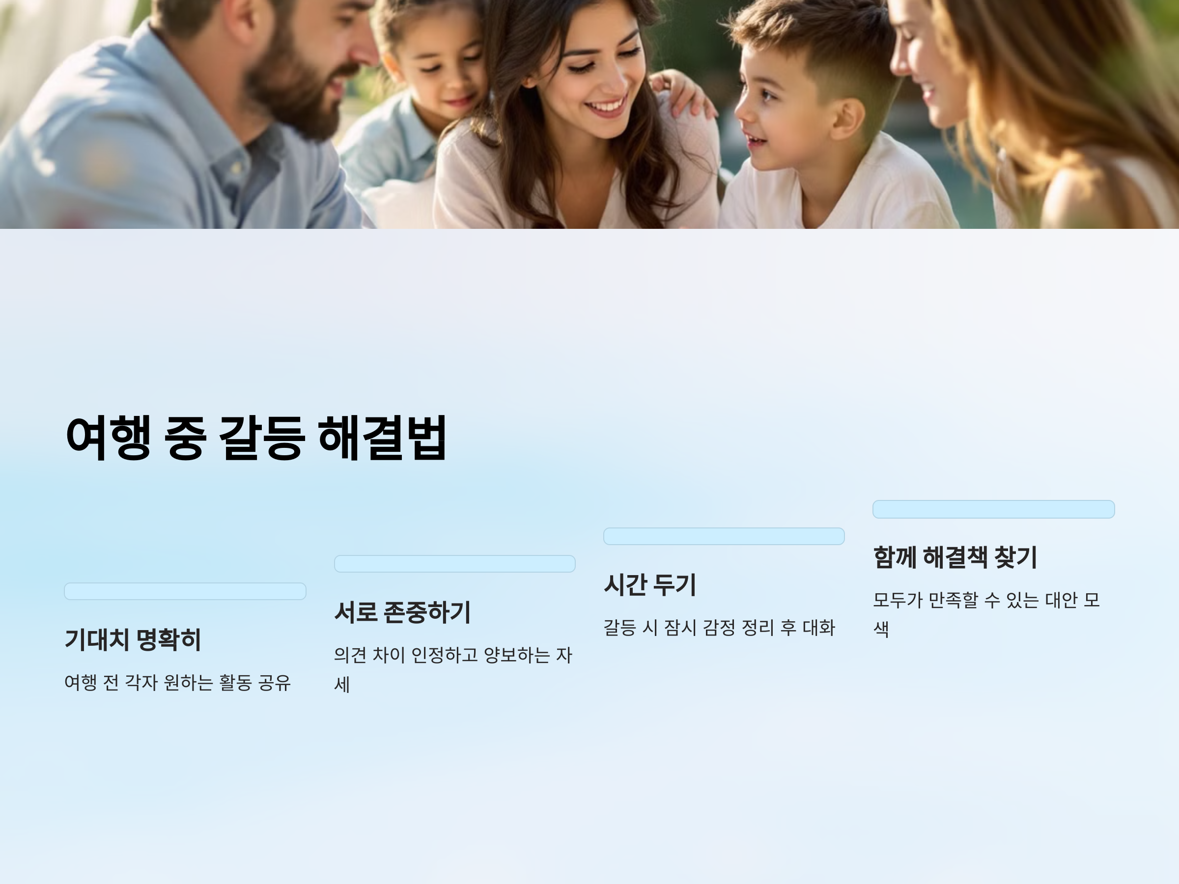 가족 여행에서 갈등을 줄이려면 처음부터 서로의 기대치를 명확히 하는 것이 중요합니다. 각자가 원하는 활동이나 여행의 목적을 명확히 하고, 이를 바탕으로 일정을 조율하면 갈등을 예방할 수 있습니다.