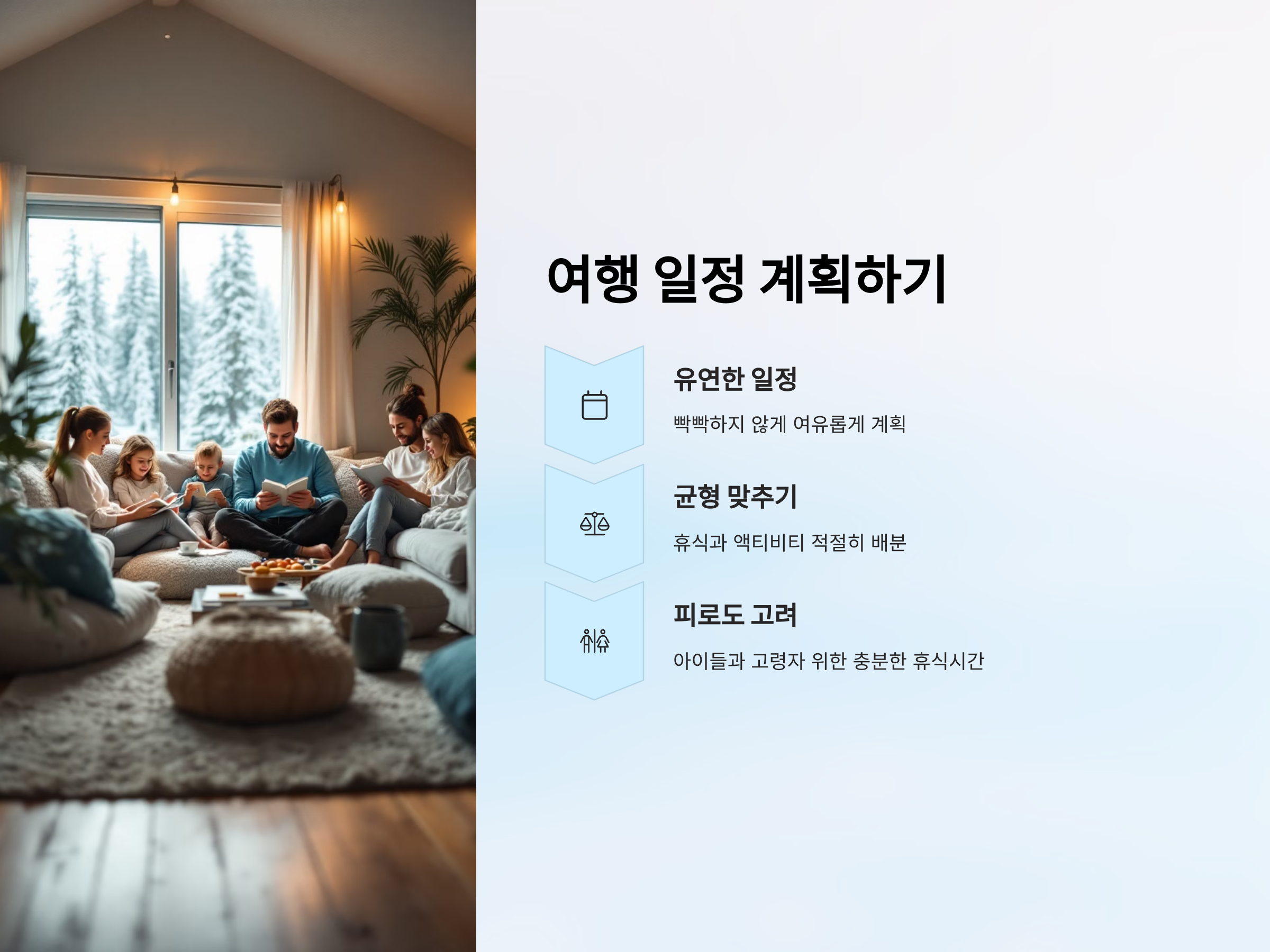 여행 일정 중에는 가족 구성원들의 피로도를 고려하여 휴식시간을 충분히 배정하는 것이 중요합니다. 아이들이나 고령의 부모님이 있을 경우, 짧은 거리의 여행지나 편안한 숙소를 선택하는 것이 더욱 좋습니다. 여행의 목적은 단지 관광뿐만 아니라, 가족 모두가 편안하게 시간을 보낼 수 있는 것임을 잊지 마세요.