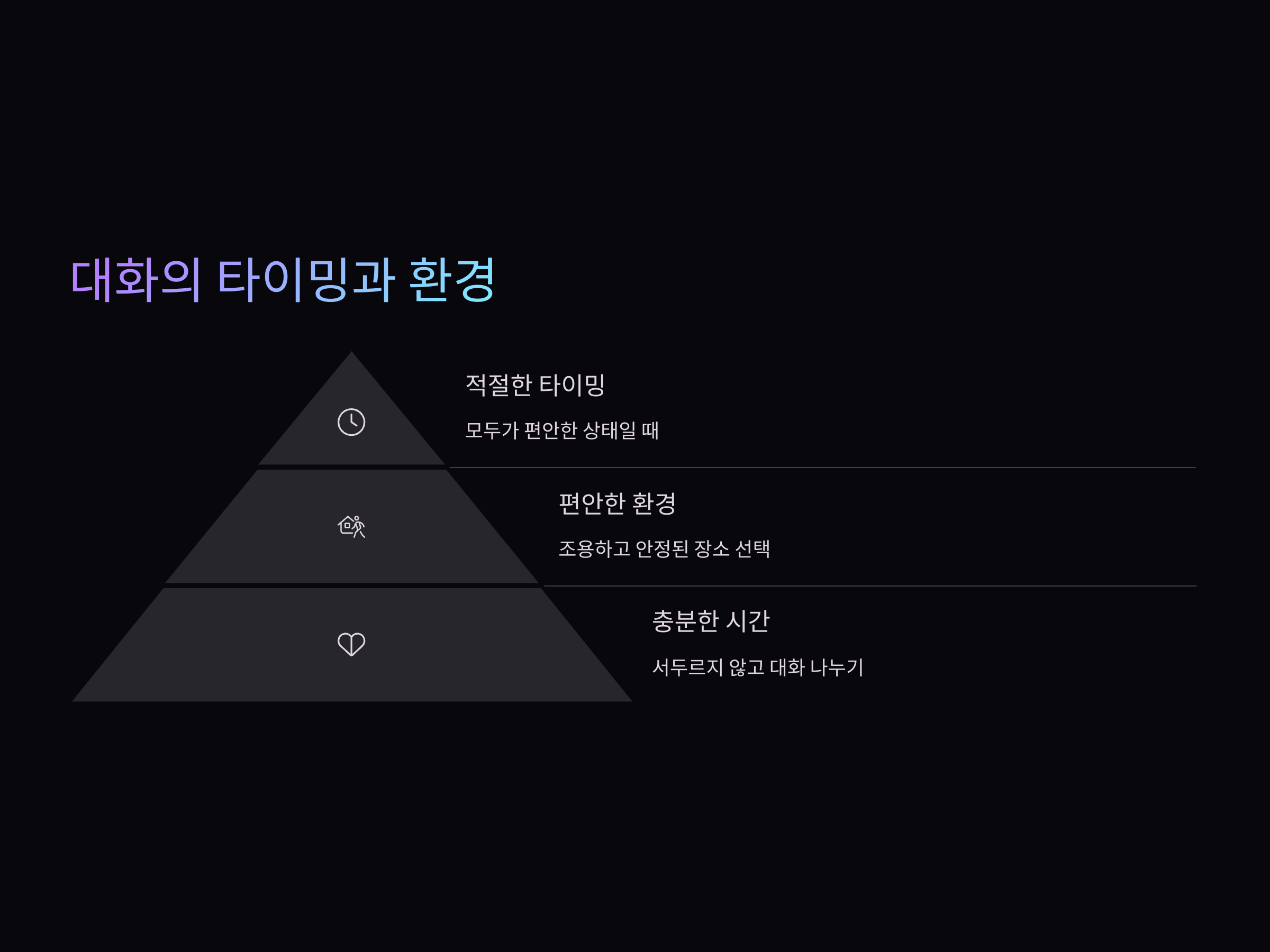 대화의 타이밍과 환경도 가족 간의 관계를 유지하는 데 큰 영향을 미칩니다. 예를 들어, 스트레스가 많은 시간대나 피곤한 상태에서 대화를 시도하면 감정적으로 격해질 가능성이 큽니다. 중요한 대화는 모두가 편안한 상태에서, 충분한 시간이 있을 때 하는 것이 좋습니다.