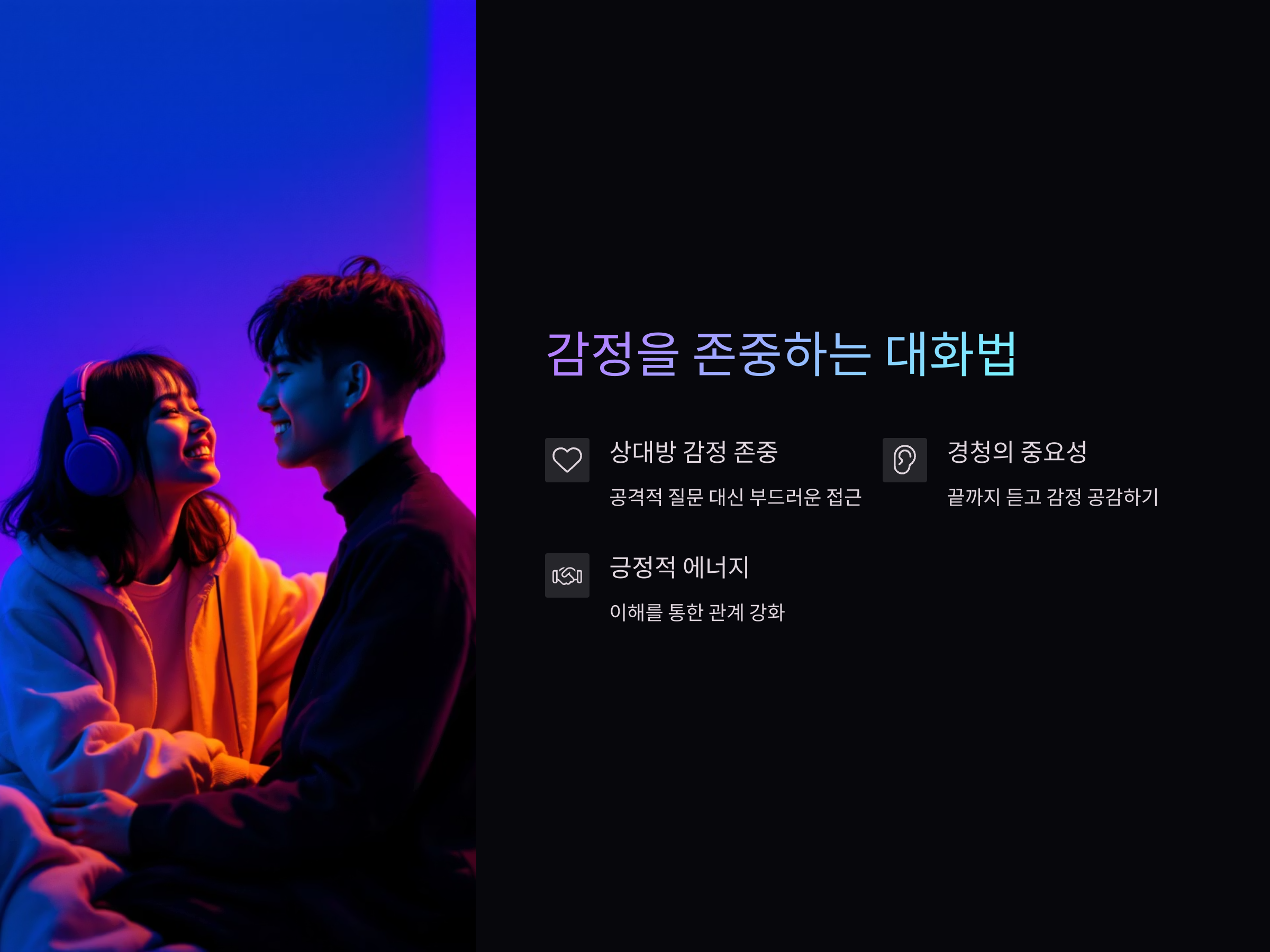 상대방의 감정을 존중하는 것은, 말하는 방식뿐만 아니라 듣는 태도에도 중요합니다. 대화 중 상대방이 말하는 내용을 끊지 않고 끝까지 듣는 것이 중요하며, 그들의 감정을 충분히 이해하려는 노력이 필요합니다. 경청은 단순히 말을 듣는 것이 아니라, 상대방의 감정을 공감하고 이해하는 과정입니다. 이 과정에서 발생하는 긍정적인 에너지는 가족 간의 관계를 더욱 풍부하게 만듭니다.