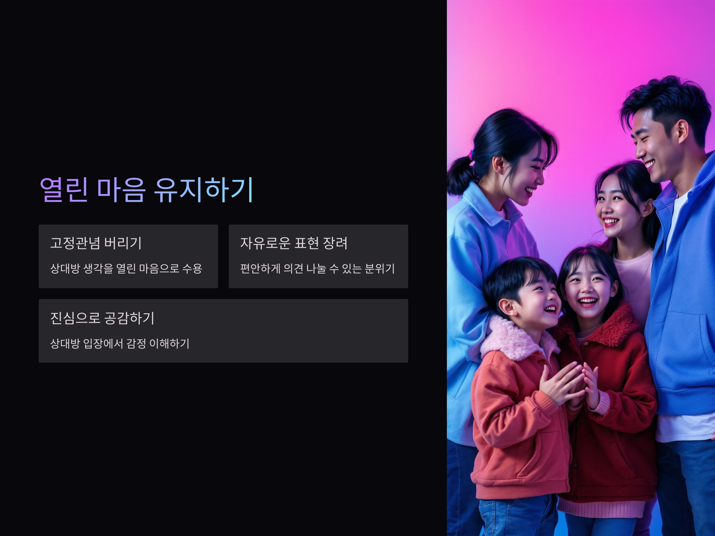 가족 간의 대화에서 가장 중요한 것은 열린 마음을 유지하는 것입니다. 상대방의 의견을 고정된 틀로만 바라보지 말고, 그들의 생각이나 감정을 이해하려는 태도가 필요합니다. 열린 마음으로 대화하면, 상대방이 더 자유롭게 자신의 생각을 표현할 수 있게 됩니다.