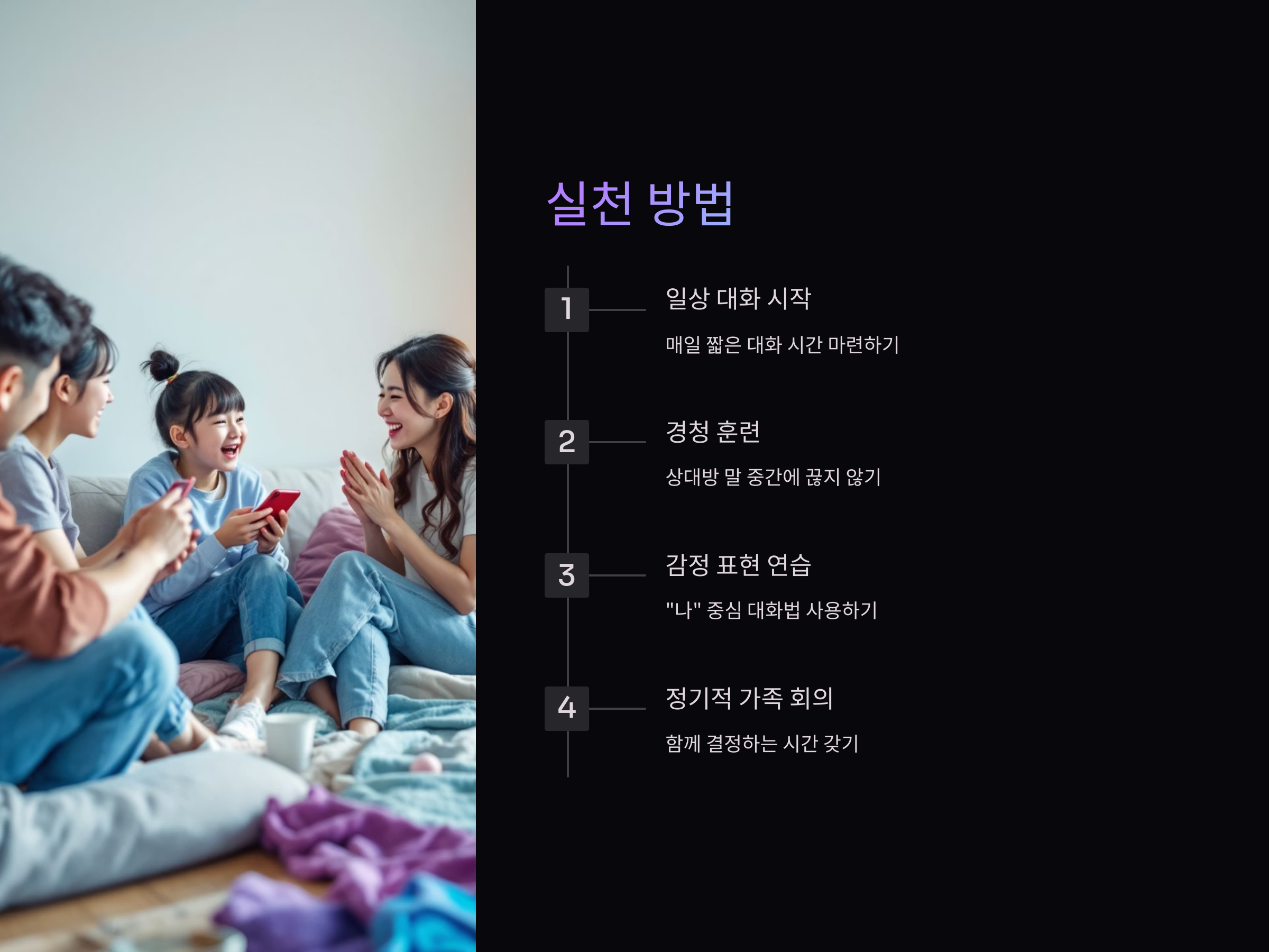 열린 마음을 유지하는 것은 단순히 상대방의 말을 듣는 것뿐만 아니라, 그들의 감정을 진심으로 받아들이는 것입니다. 예를 들어, 자녀가 고민을 털어놓을 때 그들의 이야기를 끊지 않고 충분히 듣고, 그들의 입장에서 공감하는 것이 중요합니다. 이렇게 열린 마음을 유지하는 대화법은 가족 간의 신뢰를 깊게 하고, 서로를 더 잘 이해하게 만듭니다.