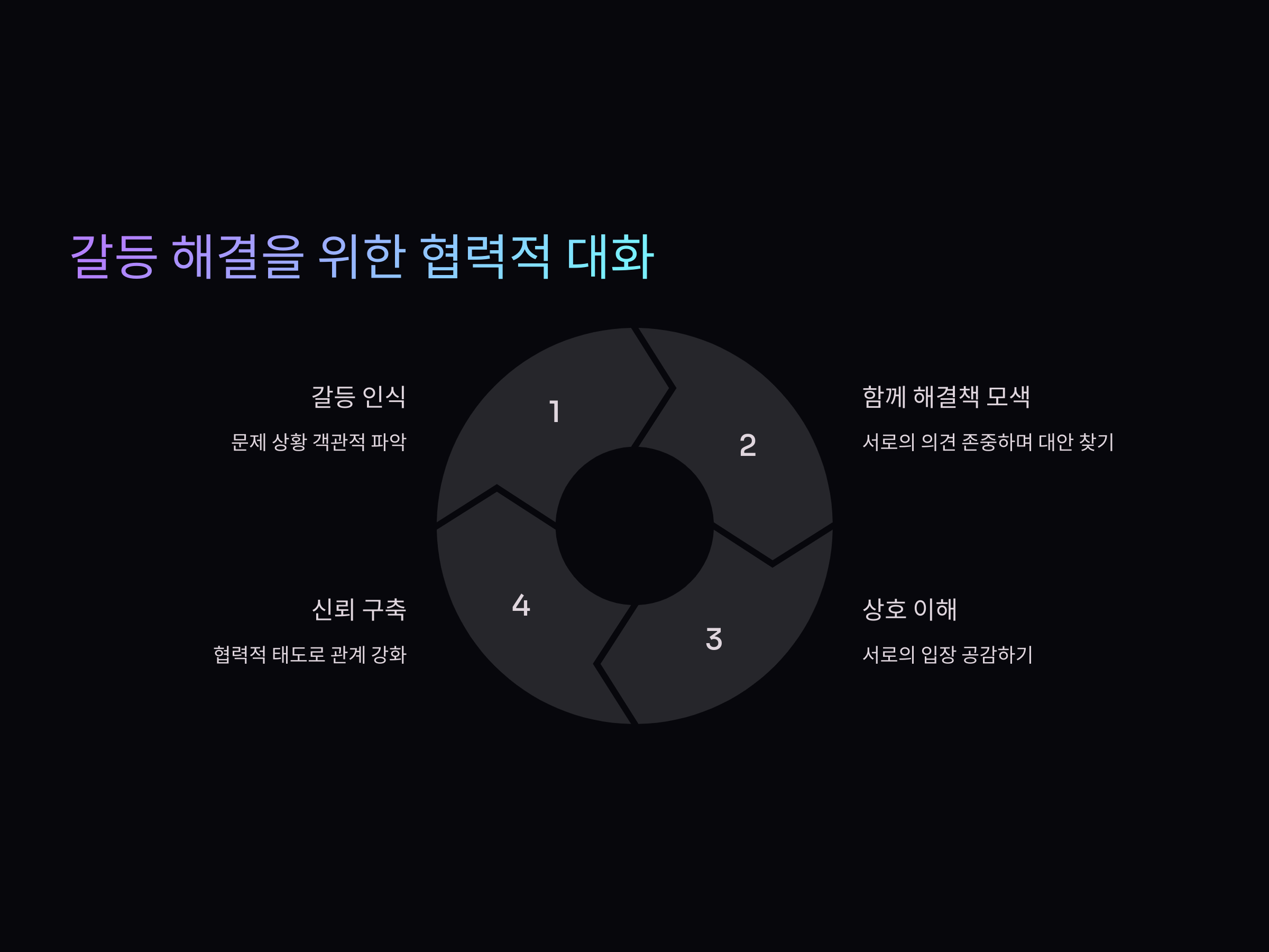 "이 문제를 어떻게 해결할 수 있을까?"라는 질문을 던지며, 서로의 의견을 나누는 것이 중요합니다. 갈등 해결을 위한 협력적인 대화는, 상대방이 자신을 이해하고 있다는 느낌을 주며, 문제를 해결하는 데 중요한 역할을 합니다. 이렇게 상호 존중과 협력적인 태도를 가진 대화는 갈등을 해결하고, 가족 간의 신뢰를 쌓는 데 큰 도움이 됩니다.