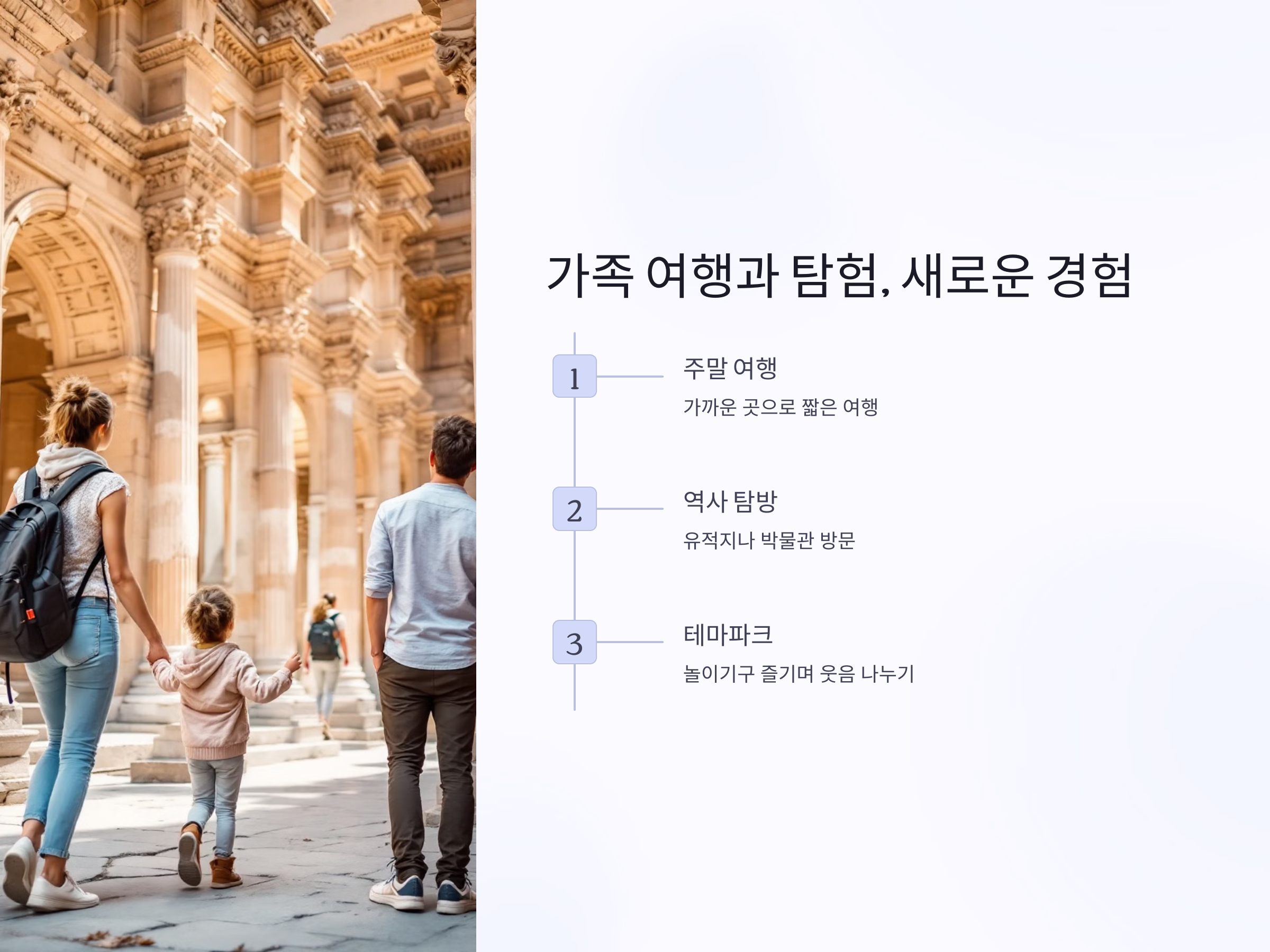가까운 장소로 짧은 주말 여행을 떠나는 것은 시간도 절약하면서 가족과의 시간을 더욱 즐길 수 있는 좋은 방법입니다. 여행지에서는 맛있는 음식도 먹고, 아름다운 경치를 감상하며 평소에 하지 못한 활동들을 경험할 수 있습니다.