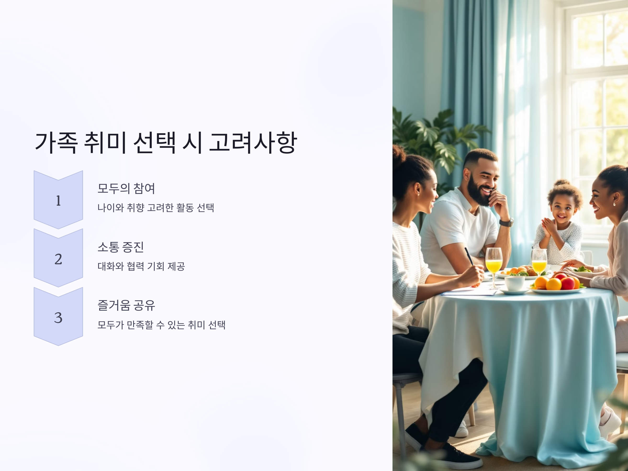 가족과 함께 어떤 취미를 선택해야 할지 고민된다면, 모두가 참여할 수 있는 활동을 선택하는 것이 중요합니다. 체력적이나 취향의 차이를 고려하여 적절한 활동을 선택하는 것이 가장 좋은 방법입니다. 특히 부모님과 아이들 모두가 즐길 수 있는 취미를 고르면, 누구나 쉽게 참여하고 즐길 수 있습니다.