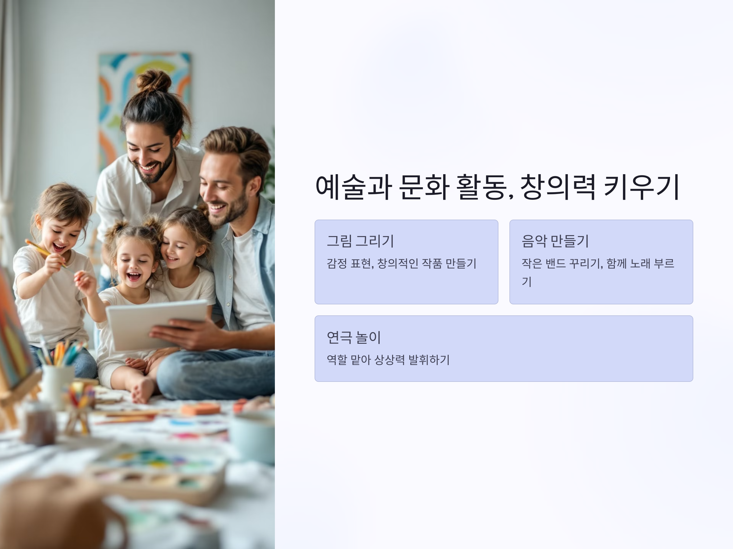 가족과 함께 예술적 감각을 발휘할 수 있는 활동은 매우 가치 있습니다. 창의력과 표현력을 기르는 데 도움을 줄 뿐만 아니라, 새로운 경험을 통해 가족 간의 유대감을 더욱 깊게 만들어줍니다.
