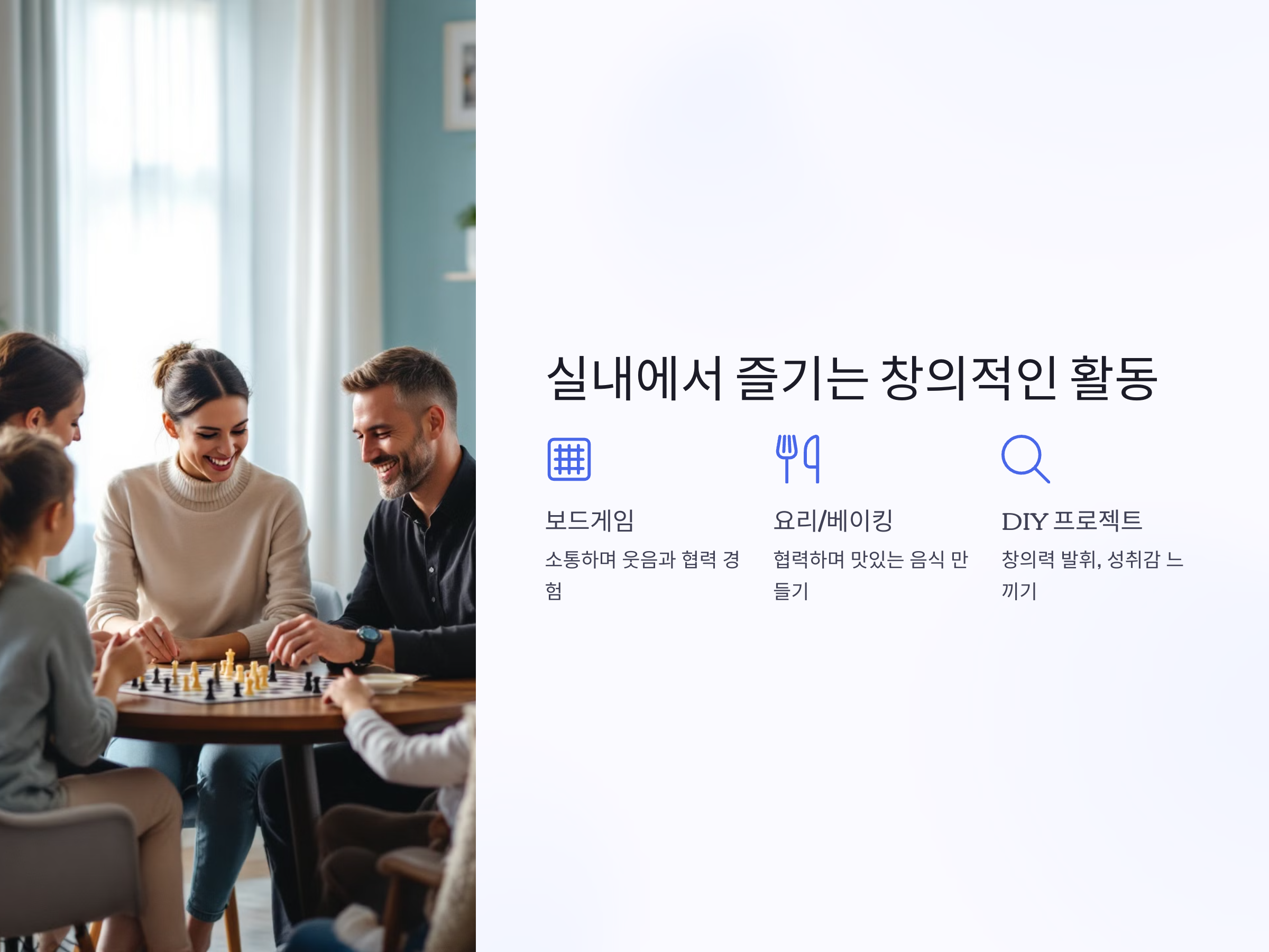 보드게임은 나이에 관계없이 가족들이 모두 즐길 수 있는 활동입니다. 대화를 나누고 협력하거나 경쟁하는 과정에서 가족 간의 소통이 자연스럽게 이루어집니다.