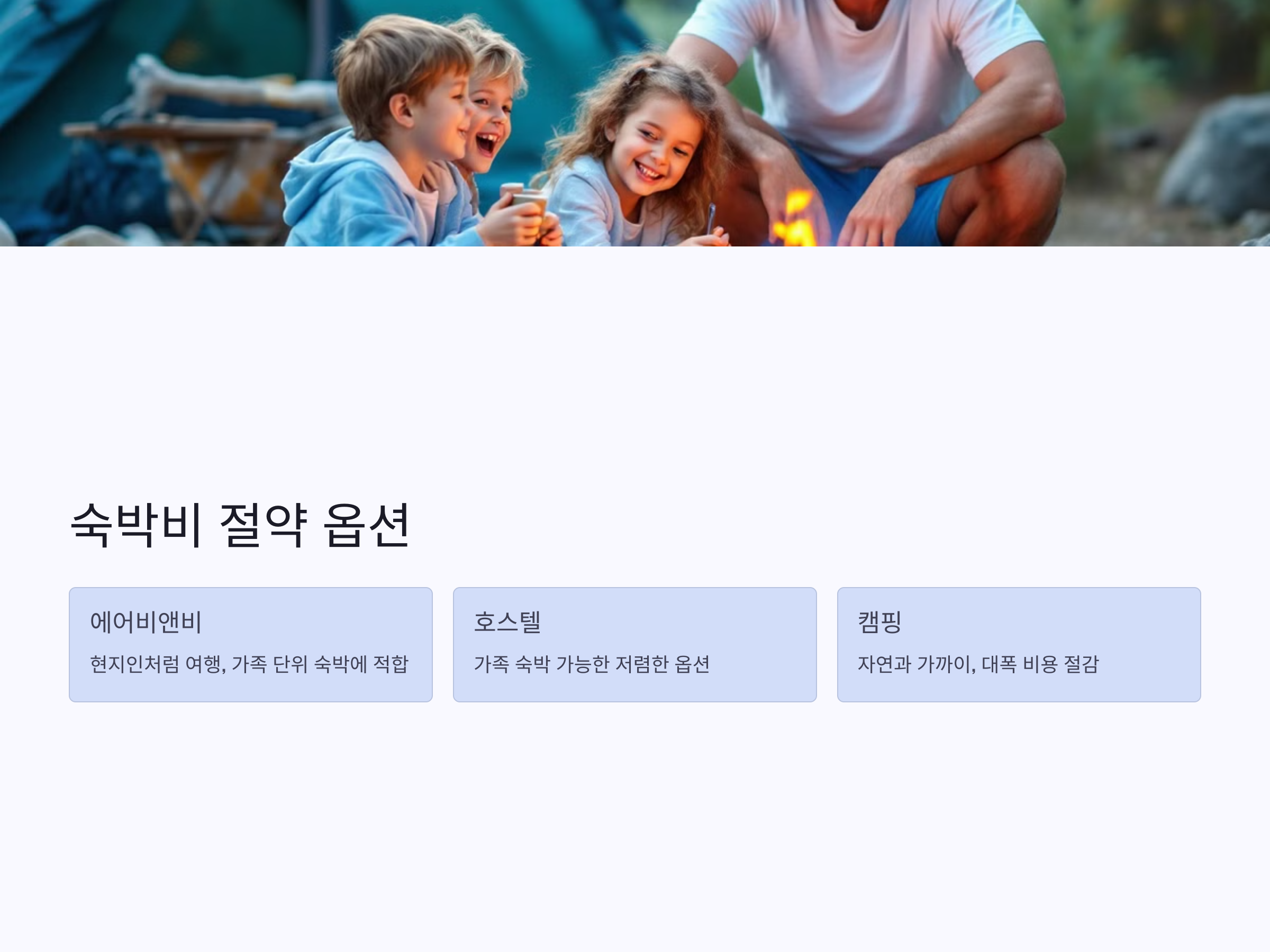 - 캠핑: 자연과 가까운 캠핑을 선택하면 숙박비를 대폭 줄일 수 있습니다. 다양한 캠핑장이 마련된 지역에서 가족과 함께 즐거운 시간을 보낼 수 있습니다.