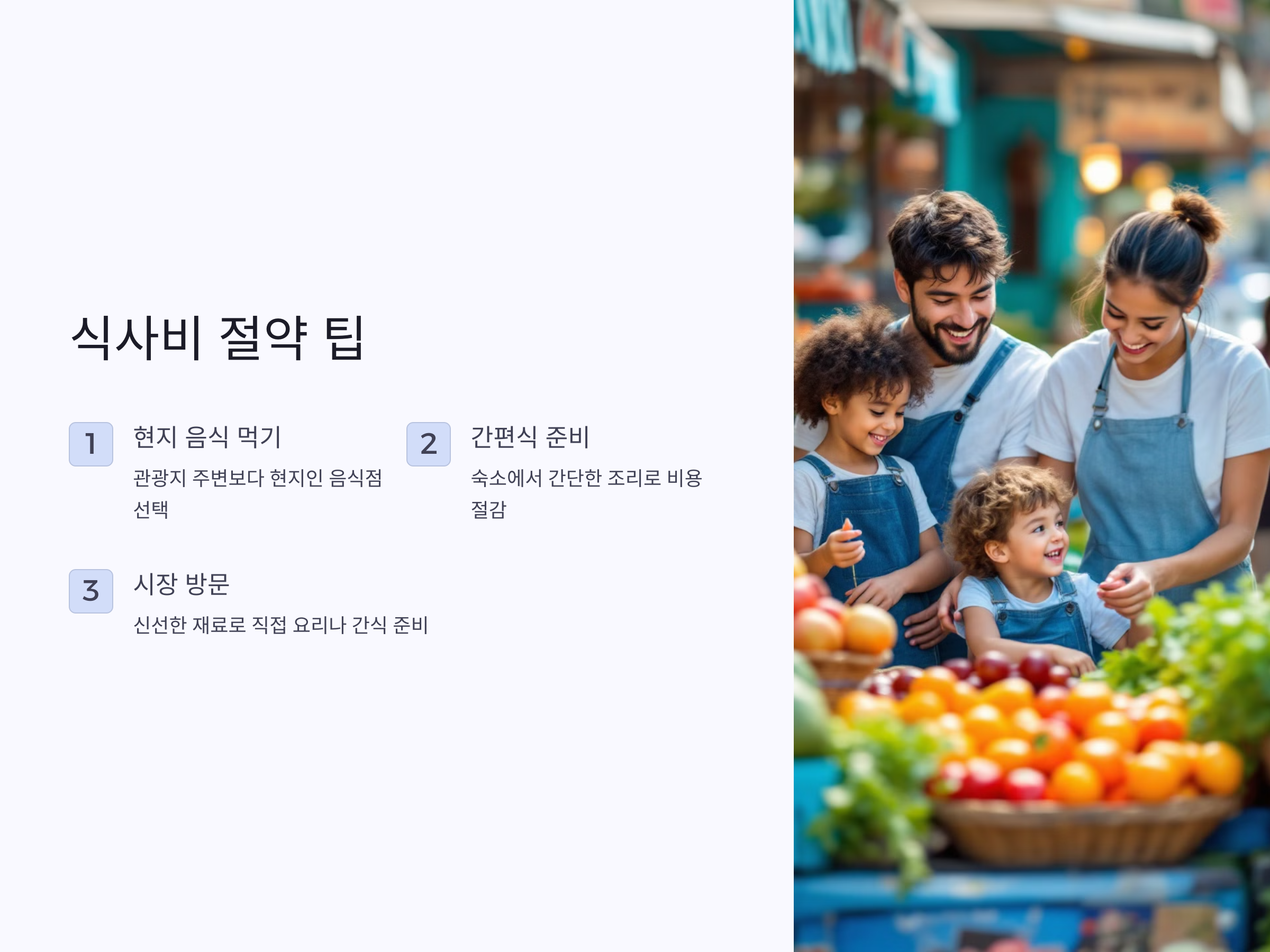 - 시장 방문: 지역 시장을 방문하여 신선한 재료를 사서 직접 요리하거나, 간단한 간식을 준비하면 식비를 절감할 수 있습니다.