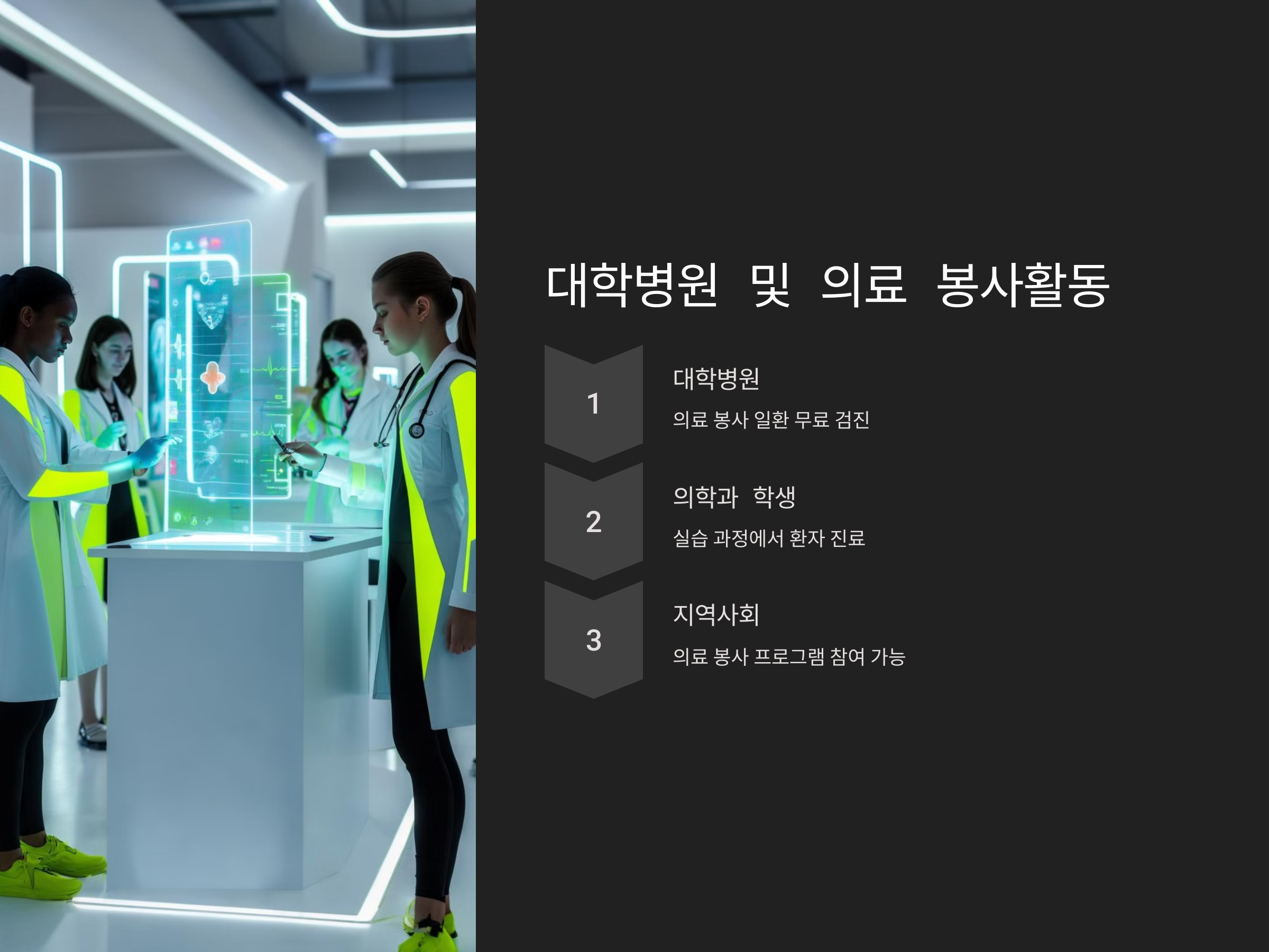 대학병원에서는 의료 봉사활동의 일환으로 무료 건강검진을 제공하는 경우가 많습니다. 의료 봉사 활동은 의학과 학생들이 실제로 실습을 진행하는 과정에서 환자를 받게 되는 경우가 많아서, 저렴한 비용 또는 무료로 검진을 받을 수 있습니다.