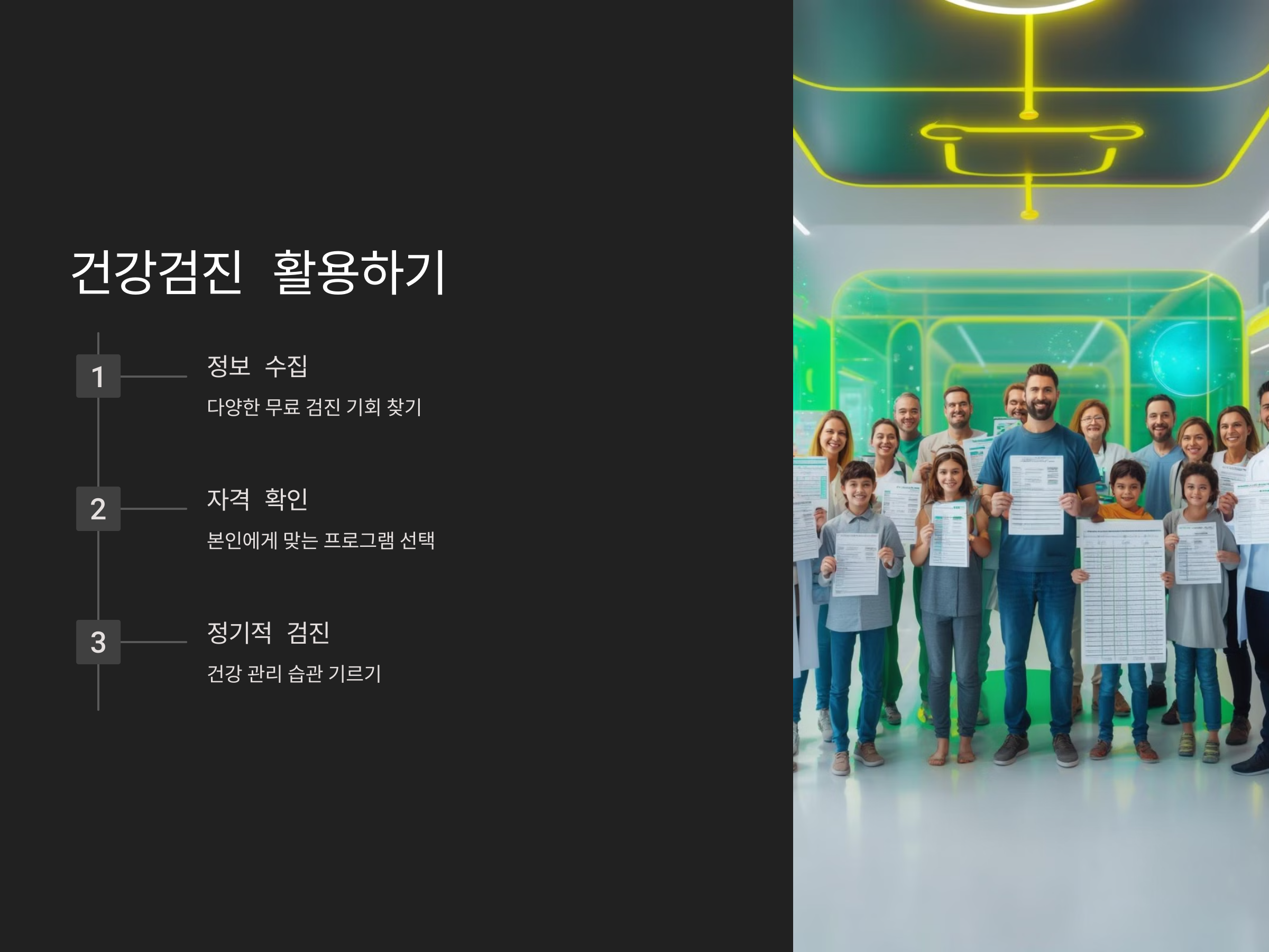 무료 건강검진을 받을 수 있는 방법은 매우 다양합니다. 이 기회를 잘 활용하면 비용 부담 없이 건강 상태를 점검할 수 있습니다. 본인이 받을 수 있는 무료 검진 서비스를 잘 찾아서 건강을 지키세요!