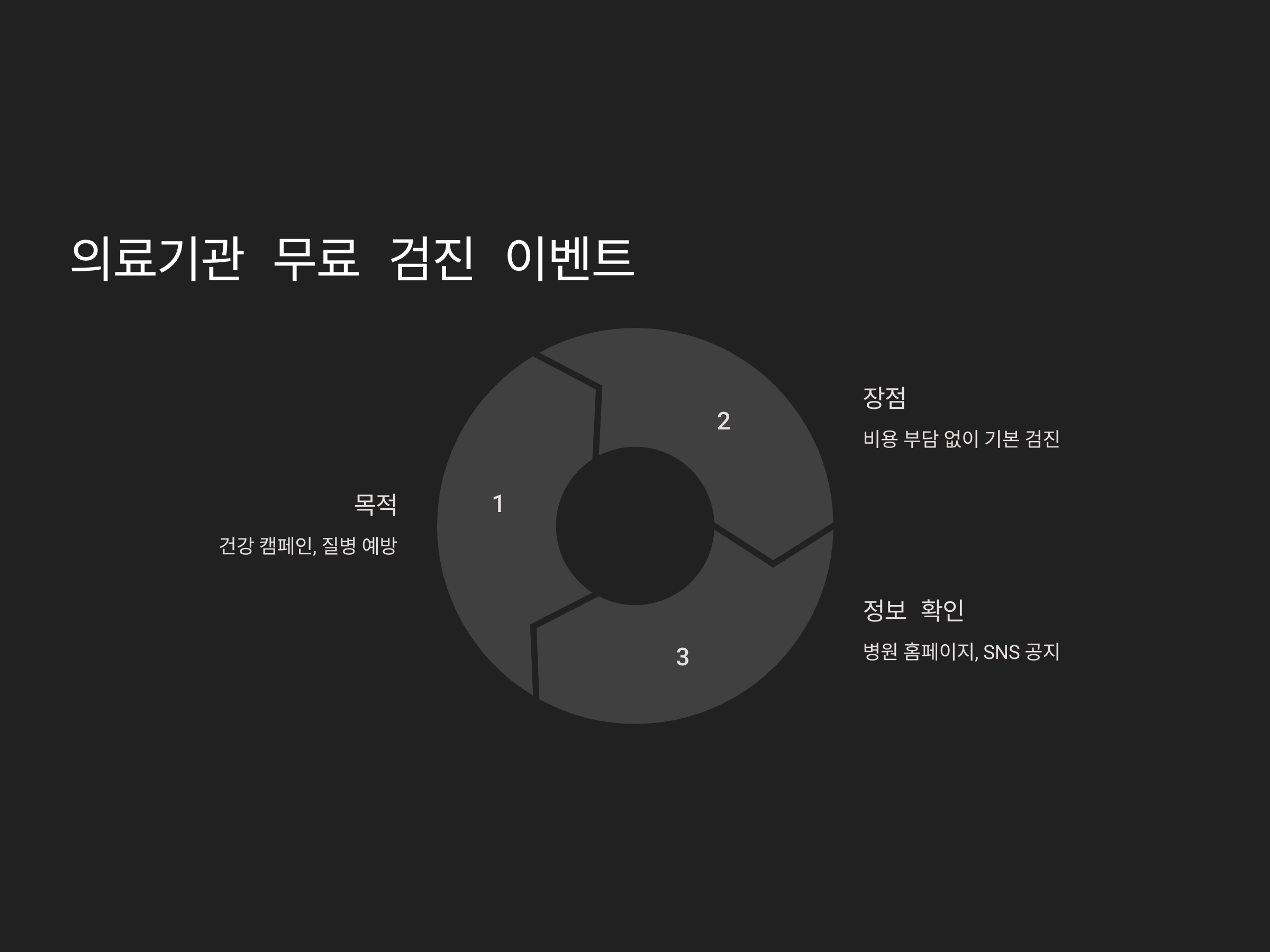 때때로 병원이나 의료기관에서는 무료 건강검진 이벤트를 개최하기도 합니다. 주로 건강 캠페인이나 특정 질병 예방을 위한 목적에서 이루어지며, 이 경우 검진 항목이 제한적일 수 있으나 비용 부담 없이 기본적인 건강 상태를 확인할 수 있는 좋은 기회입니다.