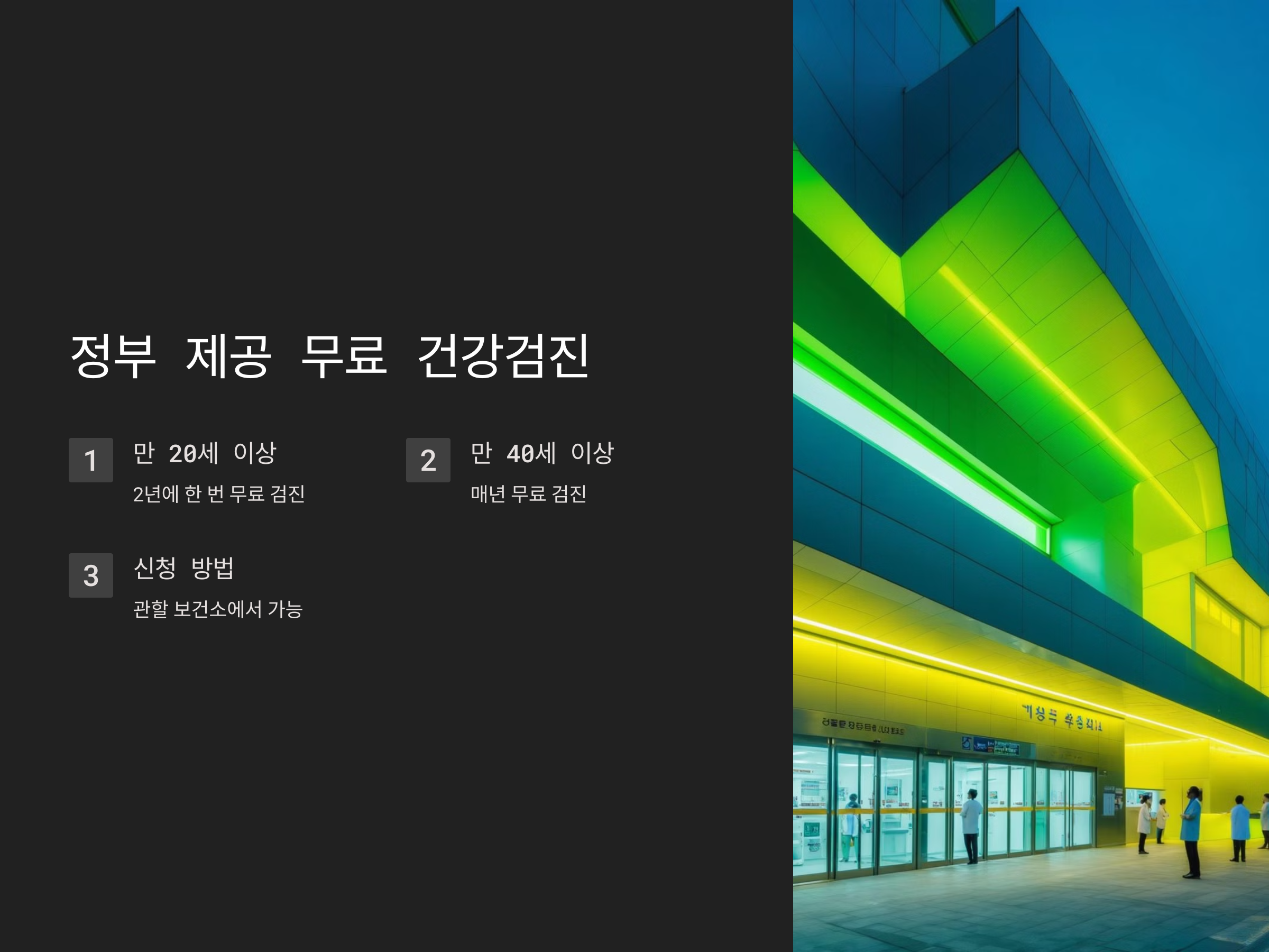 많은 사람들이 잘 모르고 지나칠 수 있는 부분이지만, 정부는 일정 연령 이상인 사람들에게 무료 건강검진을 제공하고 있습니다. 예를 들어, 만 20세 이상이면 2년에 한 번, 만 40세 이상이면 매년 건강검진을 받을 수 있는 기회가 주어집니다. 이 검진은 주민등록상 거주지에 따라 관할 보건소에서 신청할 수 있습니다.