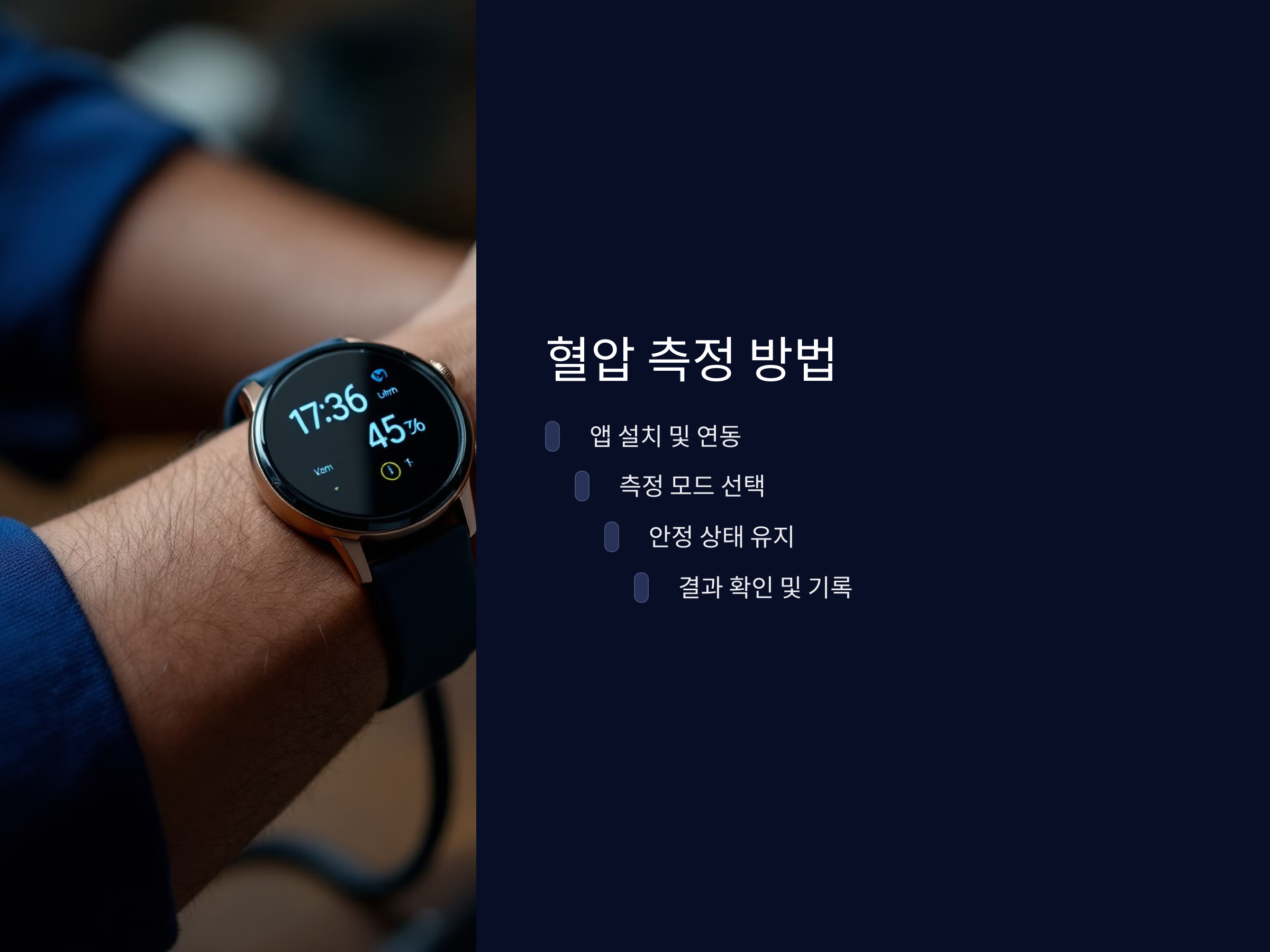 - 앱 설치: 혈압 측정 기능이 탑재된 앱을 스마트폰에 설치하고, 스마트워치와 연동하여 사용합니다.