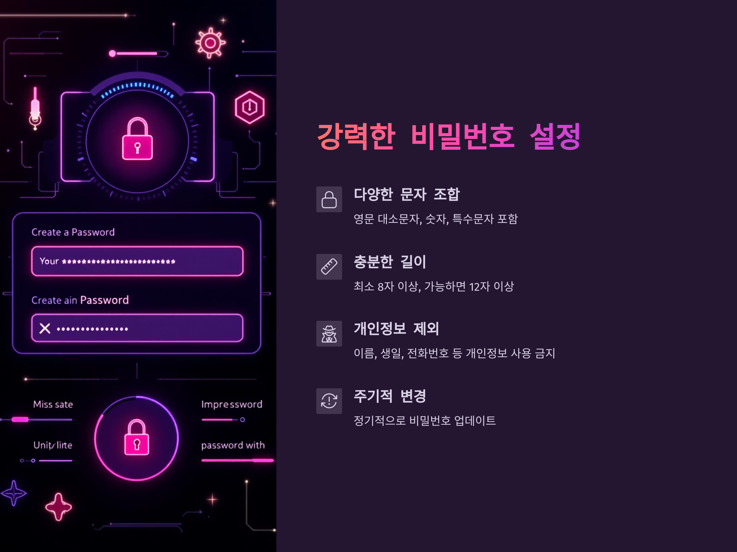 비밀번호는 계정 보호에 가장 중요한 요소입니다. 강력한 비밀번호를 설정하는 것은 해커의 공격을 막을 수 있는 첫 번째 방어선입니다. 안전한 비밀번호를 설정하는 방법은 다음과 같습니다.