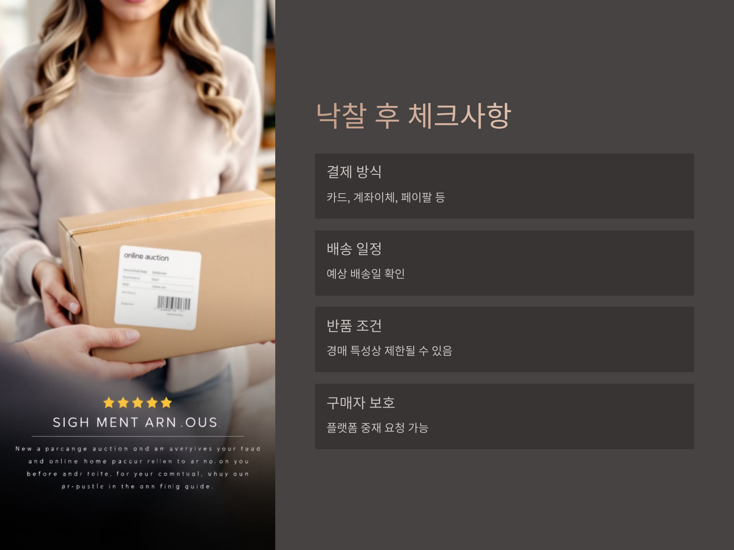 낙찰 후에는 해당 상품의 결제 방식, 배송 일정, 반품 조건을 반드시 확인해야 합니다. 특히 경매 특성상 반품이 제한되거나 불가능한 경우가 많기 때문에, 구매 전 이 부분을 미리 숙지하지 않으면 큰 낭패를 볼 수 있습니다.