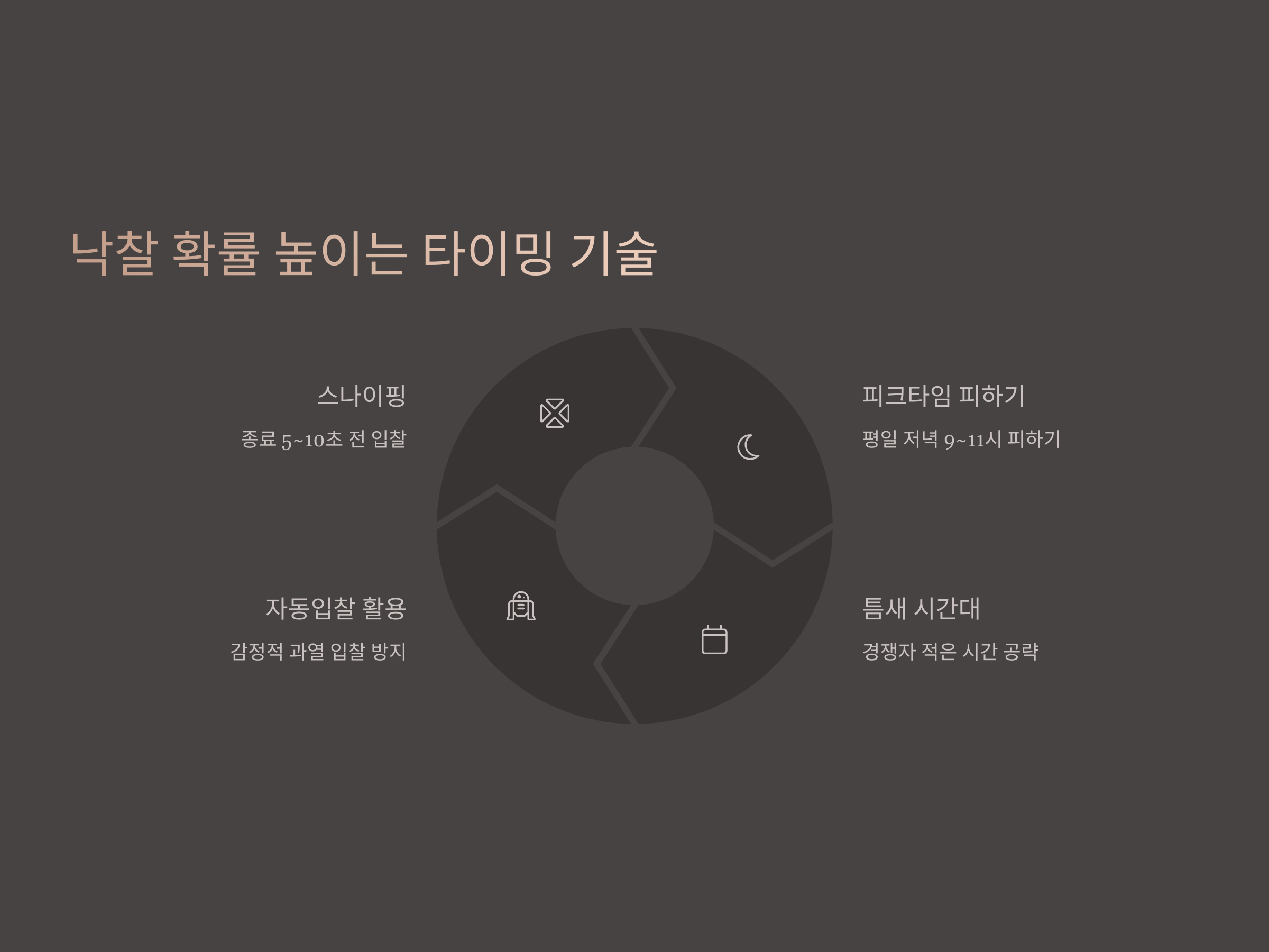 낙찰이 많이 이루어지는 시간대를 분석해보면, 평일 저녁 9시~11시 사이, 혹은 주말 오후가 가장 경쟁이 치열한 시간대입니다. 이 시간대를 피하거나 의외의 틈새 시간대를 공략하면 경쟁자가 줄어들고, 보다 유리한 가격에 낙찰 가능성이 커집니다.