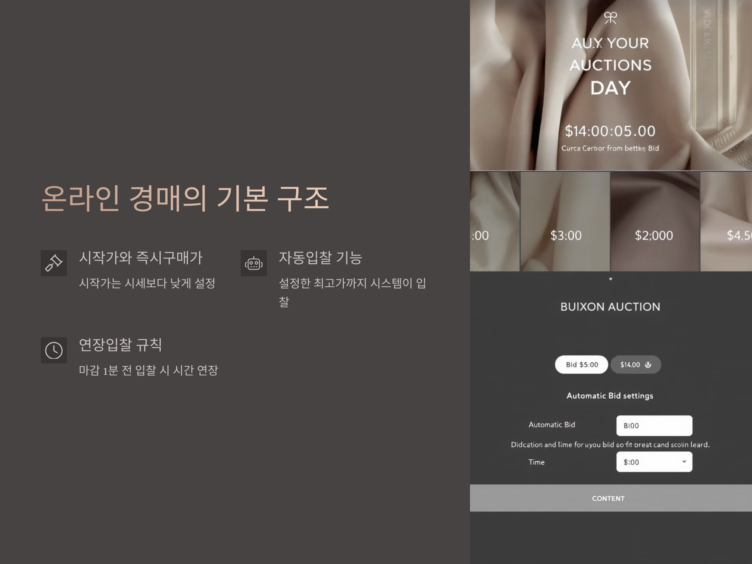 온라인 경매는 상품을 등록한 판매자와 입찰에 참여하는 구매자가 경쟁을 통해 최종 낙찰가를 결정하는 방식입니다. 기본적으로 경매에는 시작가, 즉시구매가, 자동입찰, 연장입찰 등 다양한 옵션이 존재합니다. 시작가는 대개 시세보다 낮게 설정되어 구매자들의 입찰을 유도하며, 입찰이 활발히 이루어질 경우 최종 낙찰가는 오히려 시장가보다 높아질 수도 있습니다.