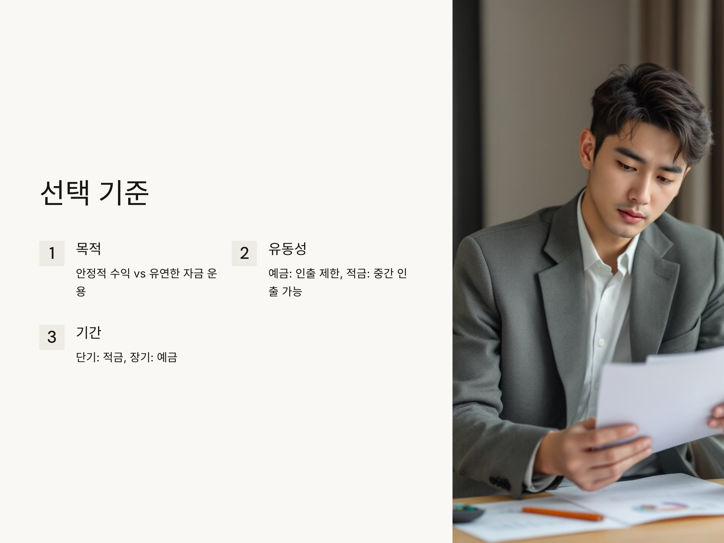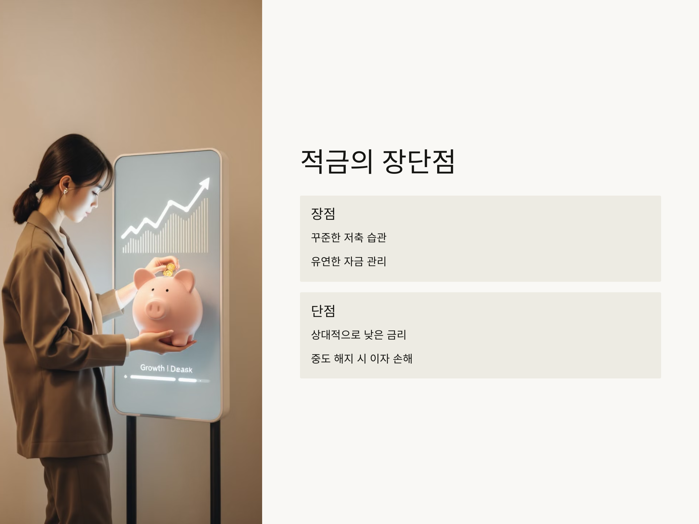 반면, 적금을 선택하면 매달 일정 금액을 불입하고, 만기 시 원금과 이자를 함께 돌려받는 방식입니다. 이 경우, 중간에 자금을 인출할 수 있기 때문에, 일정 기간 동안 꾸준히 자금을 불입하며 저축을 원하는 분들에게 적합합니다. 특히, 적금의 경우 소액을 매달 불입하기 때문에 자금 운용이 유연합니다.