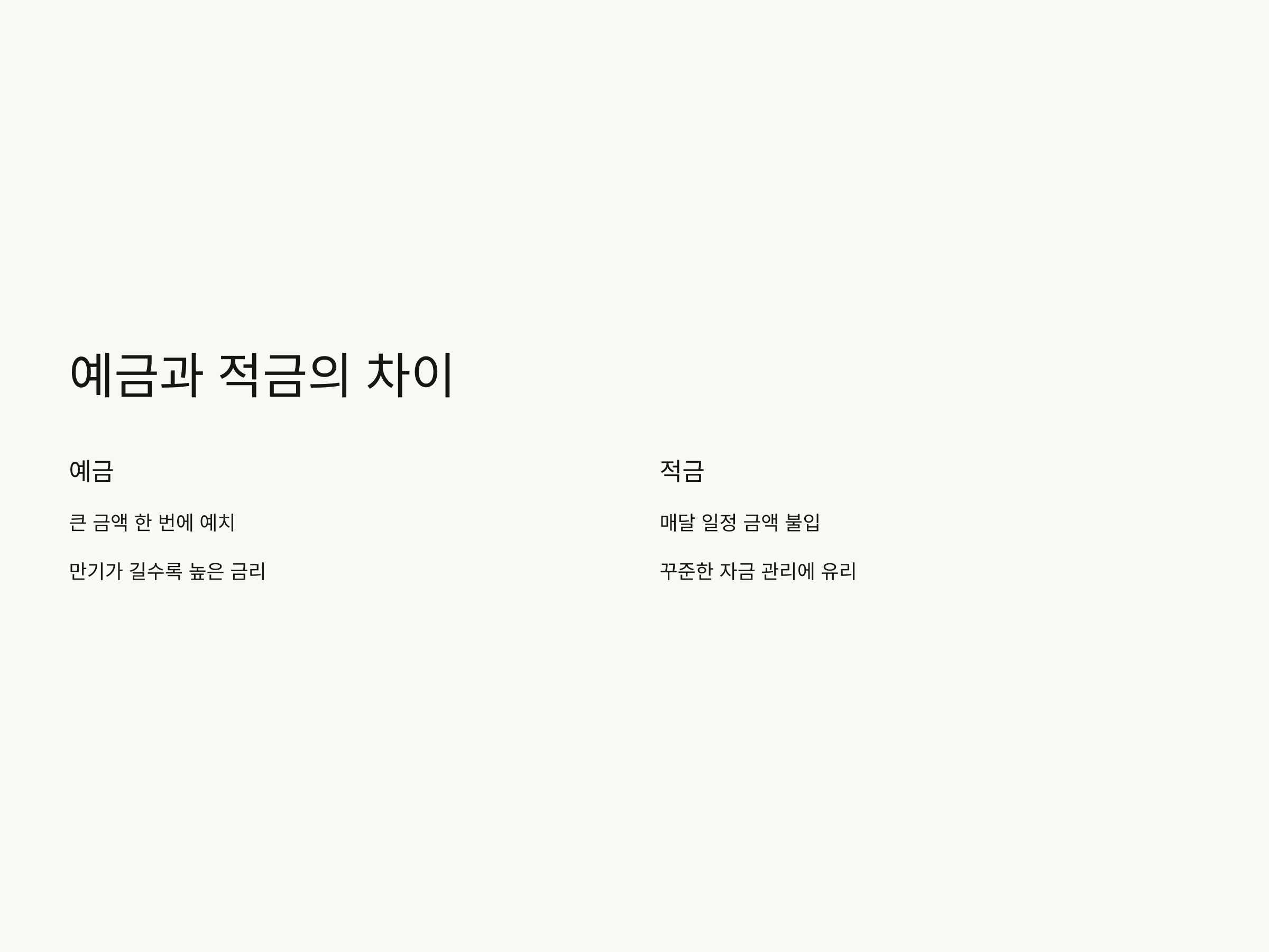 반면, 적금은 매달 일정 금액을 불입하면서 수익을 얻는 방식입니다. 보통 고정 금리를 제공하지만, 예금과는 달리 일정 기간 동안 꾸준히 돈을 넣어야 한다는 특징이 있습니다. 적금은 자금을 일시불로 넣는 예금보다 불입 기간 동안 자금을 꾸준히 관리하고 싶은 분들에게 유리합니다.