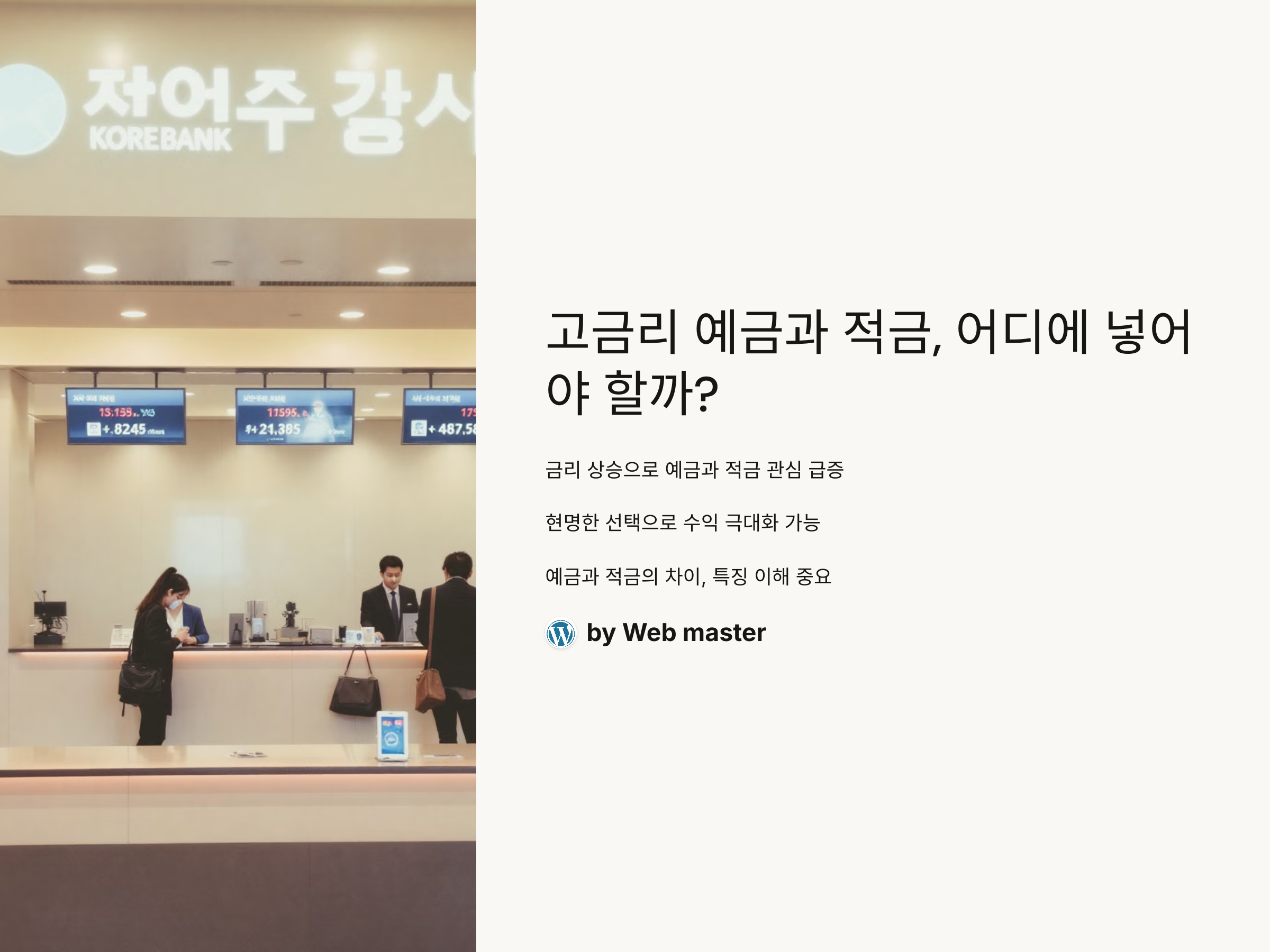 고금리 예금과 적금의 선택은 자금의 유동성과 목표 기간에 따라 달라집니다. 단기적인 금융 목표가 있다면 적금이 적합하고, 장기적인 투자 및 안전한 수익을 원한다면 예금이 유리합니다.