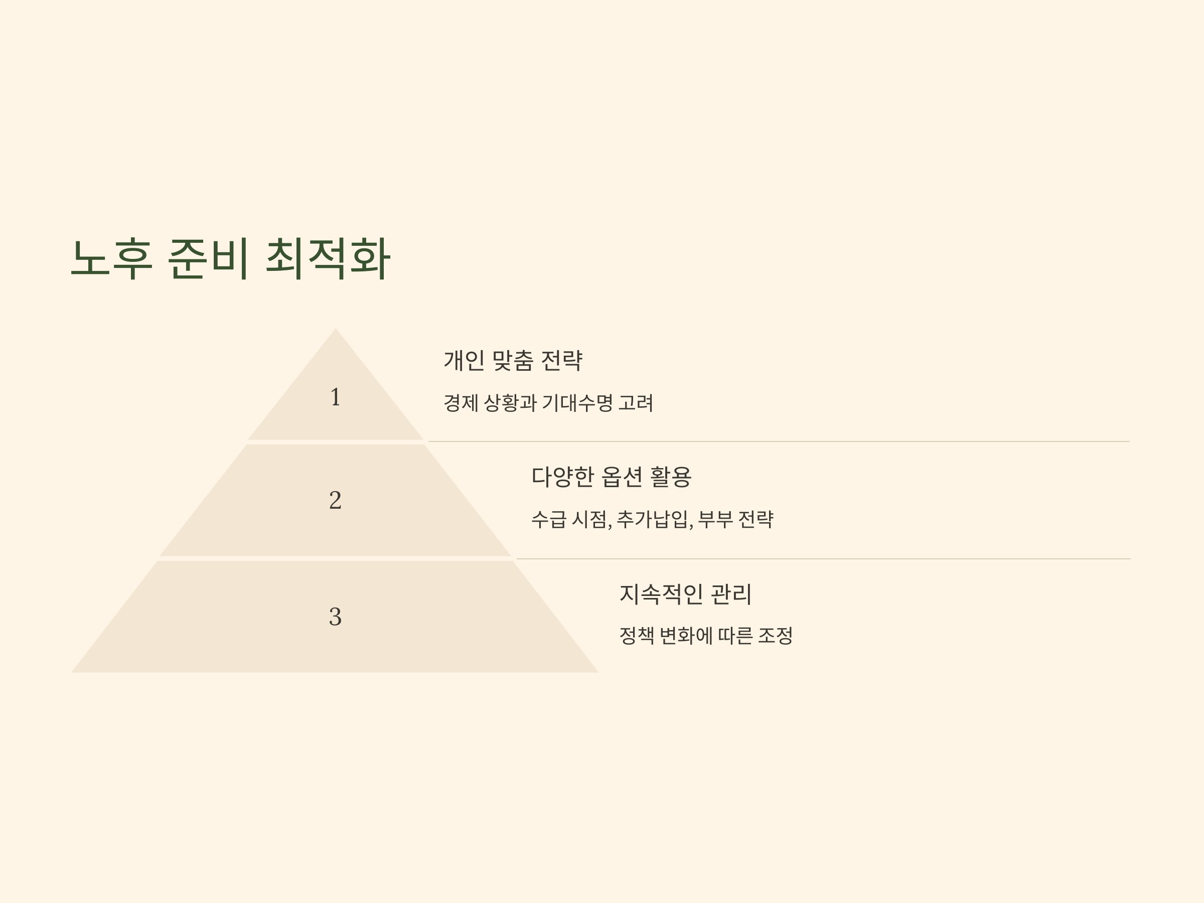 국민연금은 고령자의 안정적인 노후 생활을 위한 중요한 재원입니다. 수급 시점 조정, 추가납입, 부부 연금 전략, 소득활동 조정, 기초연금과의 병행 등을 고려하면 연금 수령액을 최적화할 수 있습니다. 자신의 경제적 상황과 기대수명을 고려하여 가장 유리한 선택을 하는 것이 중요합니다. 국민연금 수급 전략을 잘 세워서 노후를 더욱 풍요롭게 준비하세요.