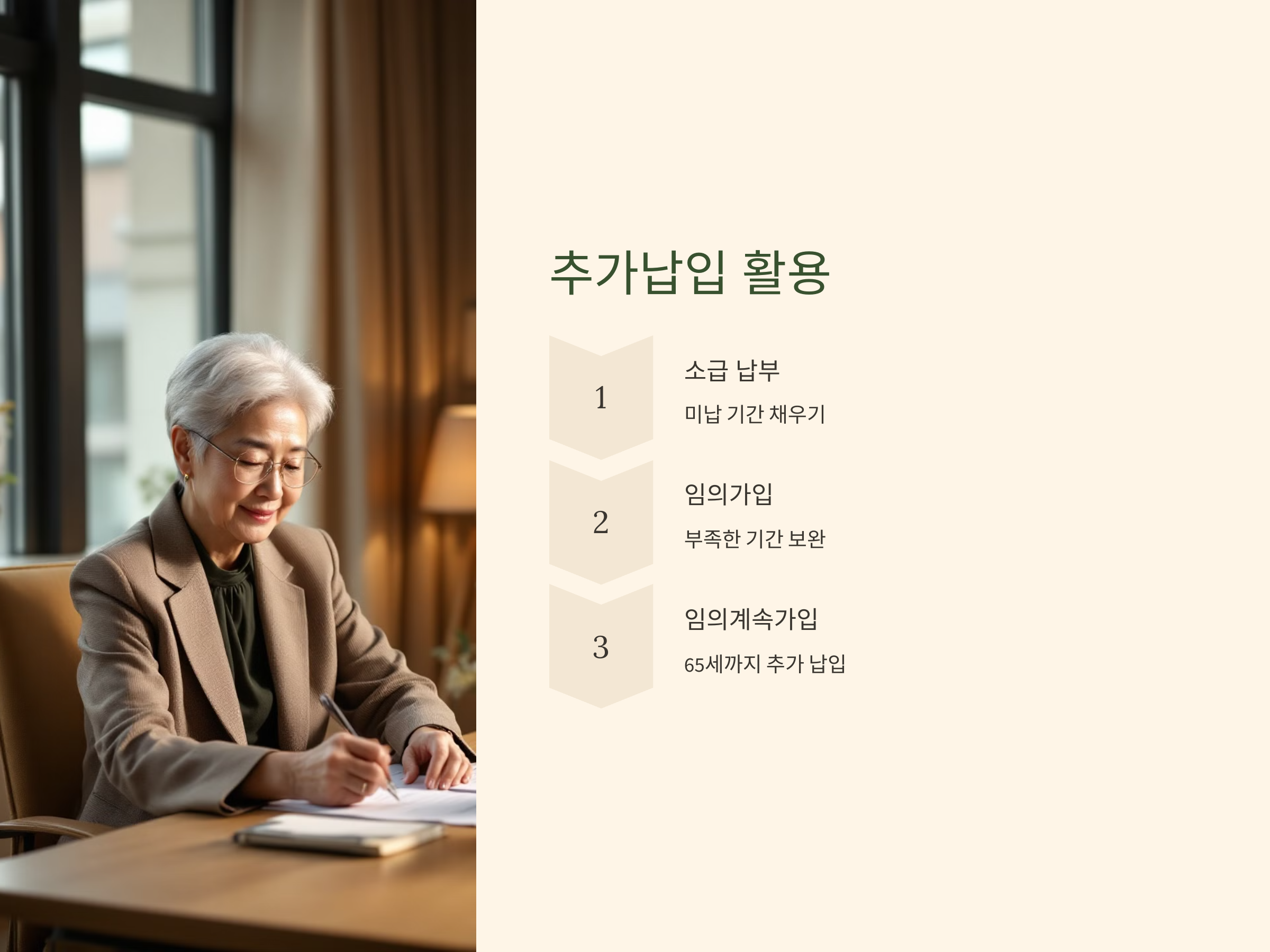 추가납입은 본인이 납부하지 않은 기간에 대해 소급 납부를 하거나, 임의가입을 통해 부족한 가입 기간을 채우는 방식입니다. 특히, 60세 이후에도 연금 가입이 가능한 ‘임의계속가입’ 제도를 활용하면 최대 65세까지 추가 납입을 할 수 있어 연금액을 늘릴 수 있습니다.