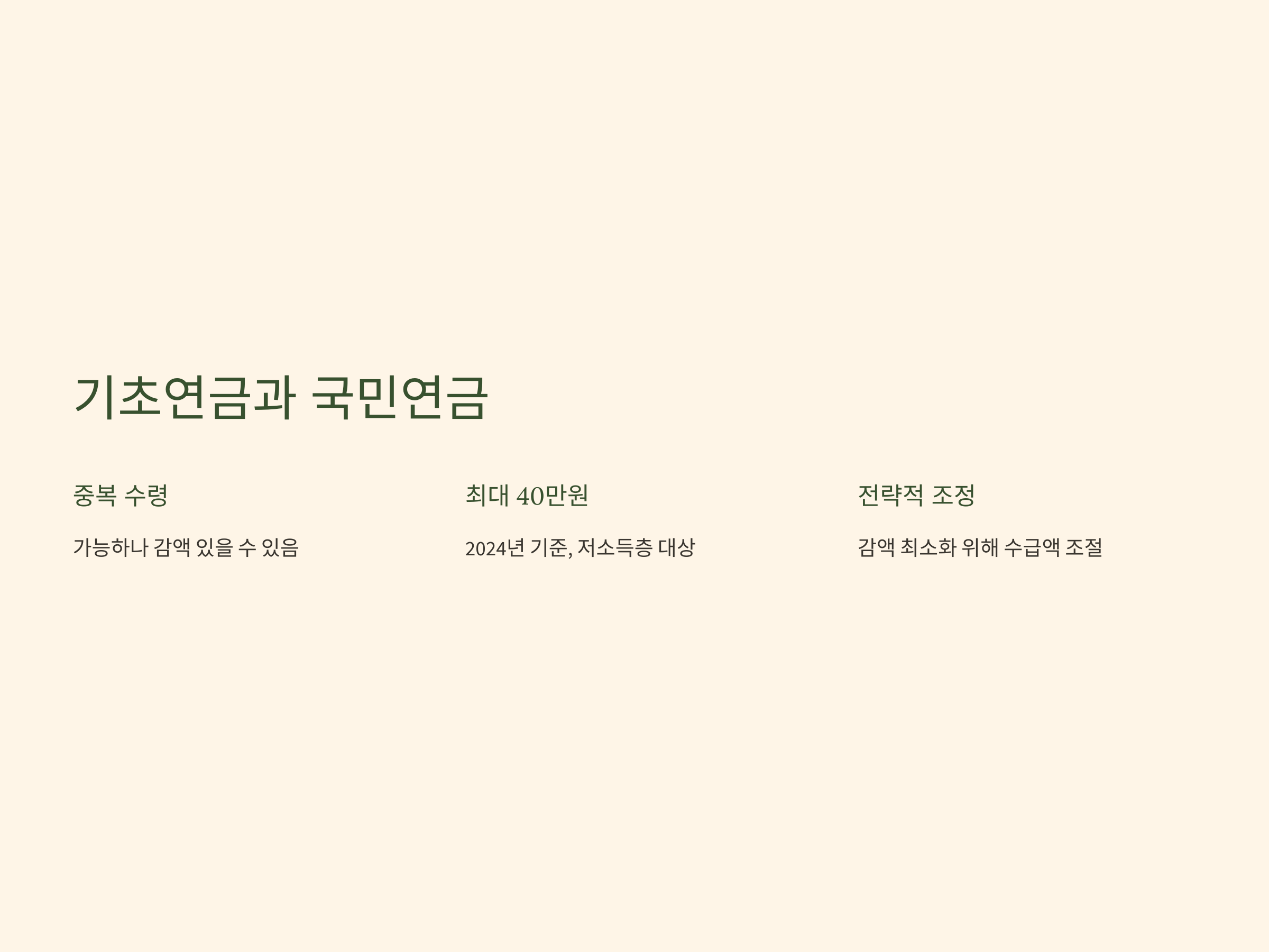 국민연금과 기초연금은 중복 수령이 가능하지만, 국민연금 수령액에 따라 기초연금이 감액될 수 있습니다. 기초연금은 만 65세 이상 저소득층에게 지급되는 연금으로, 국민연금 가입 기간이 짧거나 연금액이 적은 경우 최대 40만 원(2024년 기준)까지 받을 수 있습니다.