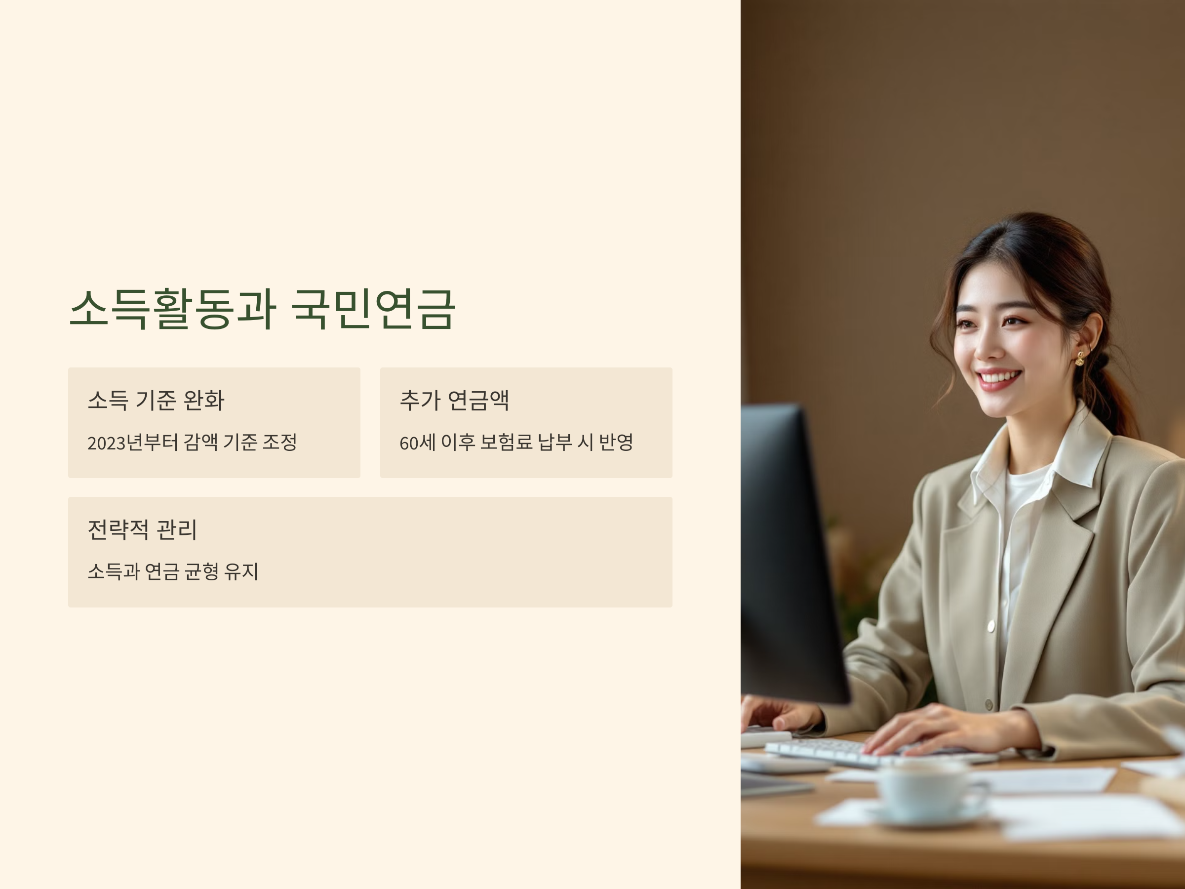 또한, 2023년부터 국민연금 수급자의 소득 기준이 완화되면서 일부 감액 기준이 조정되었습니다. 이에 따라 일정 소득 이하의 경우 연금 감액 없이 추가 소득을 유지할 수 있는 가능성이 높아졌습니다.