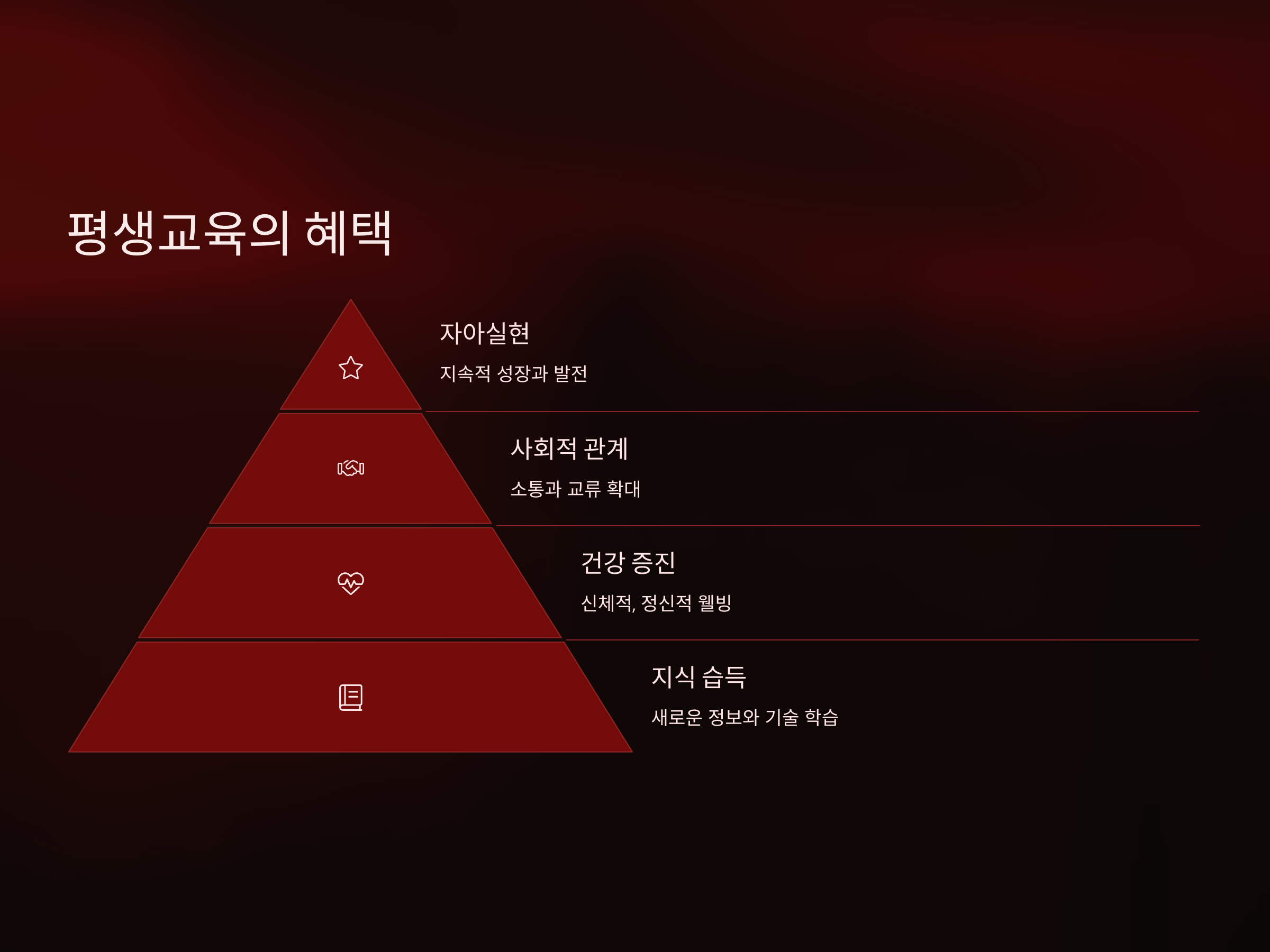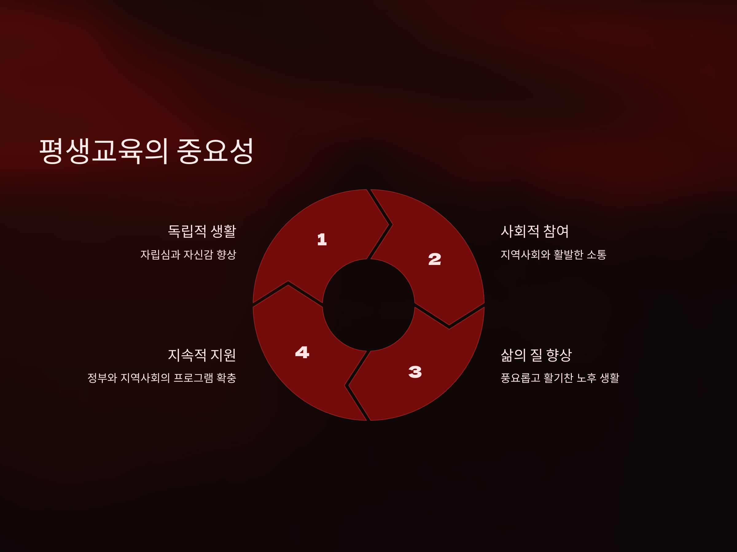 고령자들에게 평생교육은 더 나은 삶을 위한 중요한 도전이자 기회입니다. 고령자들이 교육에 참여함으로써 얻는 정신적, 신체적, 사회적 혜택은 매우 큽니다. 이러한 교육은 고령자들이 독립적으로 생활할 수 있게 도와주고, 사회와 더욱 활발히 소통할 수 있는 기회를 제공합니다.