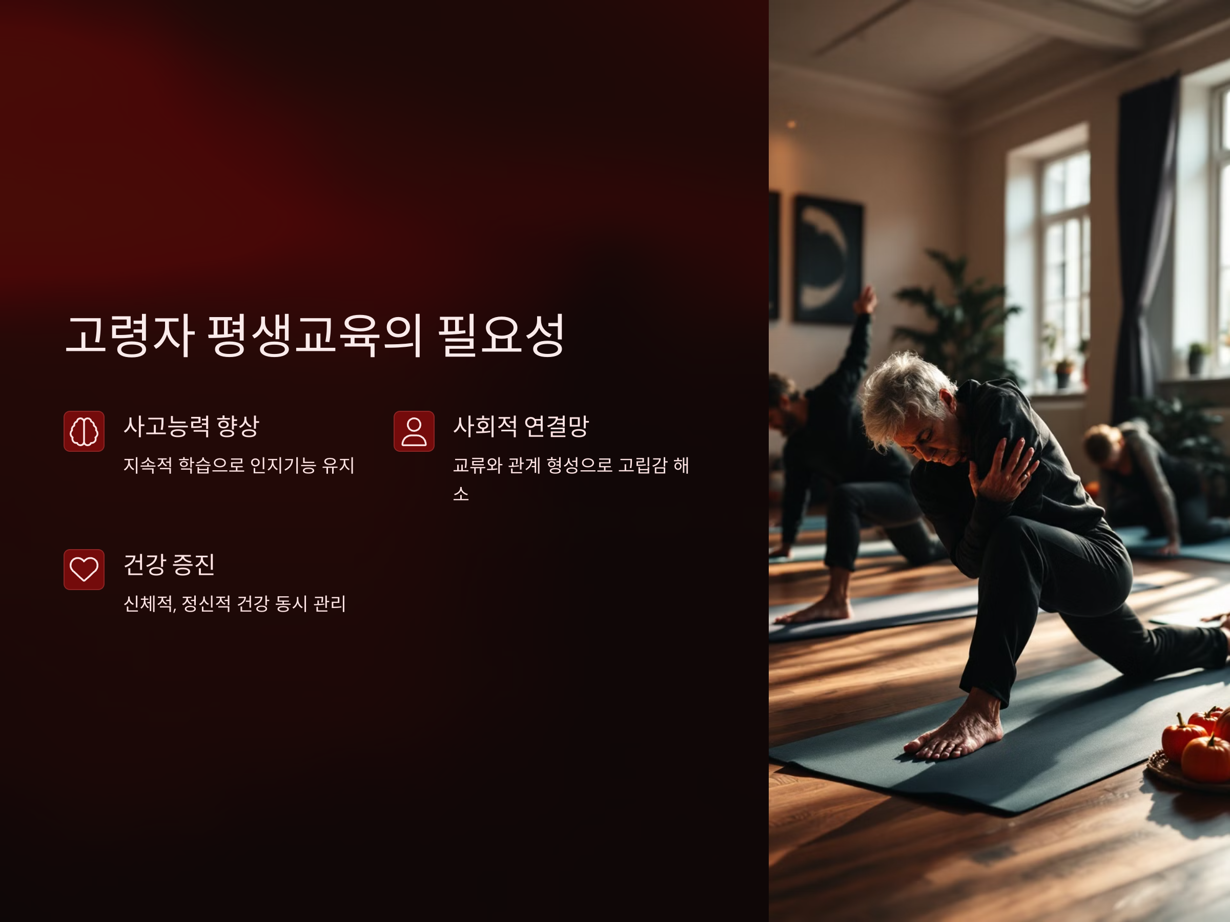 이와 더불어, 고령자들에게 맞는 교육은 건강 증진과 관련된 내용을 다루기도 하며, 이는 노후에 발생할 수 있는 다양한 질병 예방과 관리에 도움을 줄 수 있습니다. 예를 들어, 요가나 스트레칭, 심리적 안정 등을 주제로 한 강좌들은 고령자들의 신체적, 정신적 건강을 동시에 돌볼 수 있는 좋은 기회를 제공합니다.