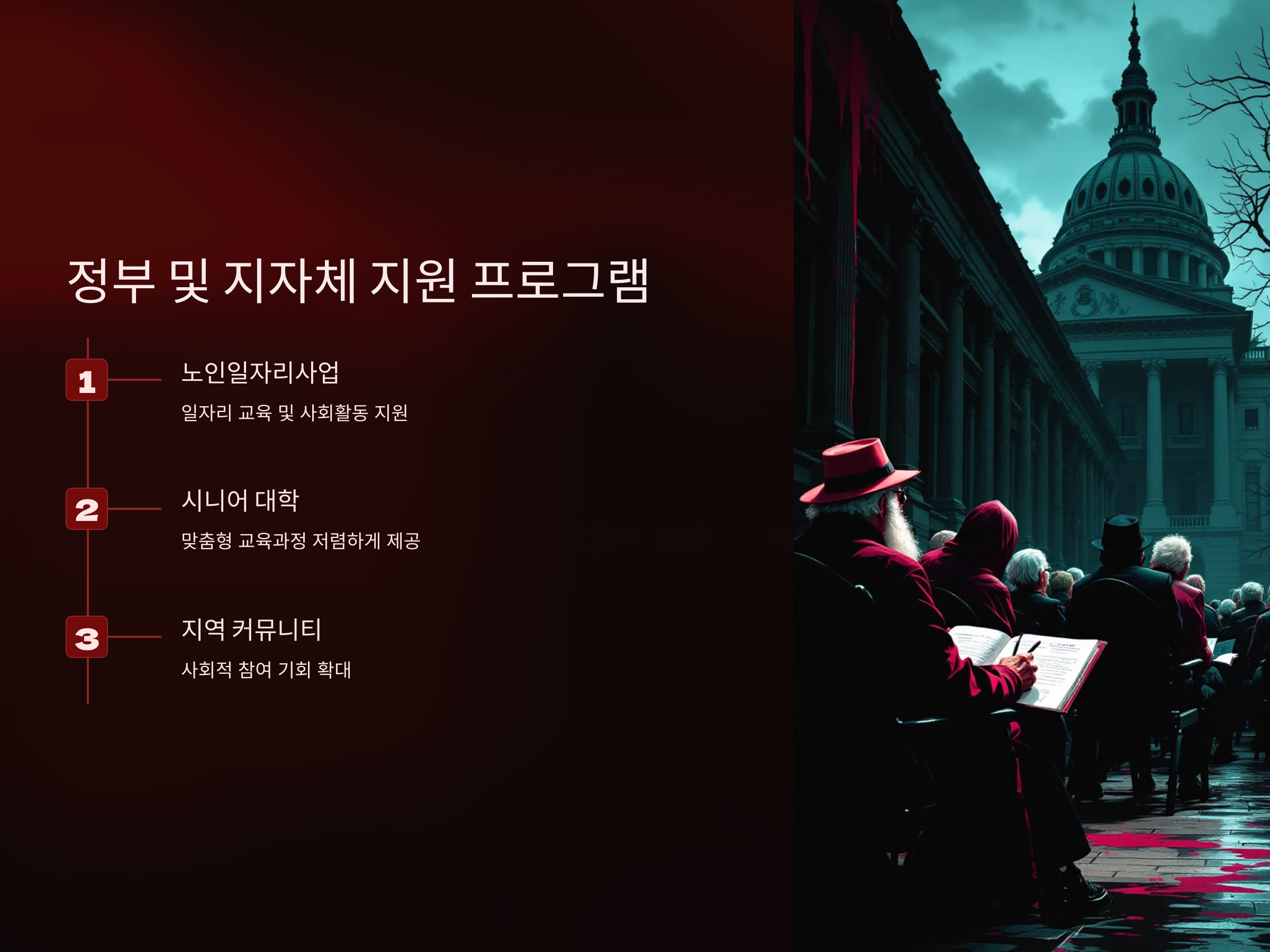 정부와 지방자치단체는 고령자들의 평생교육을 지원하기 위해 다양한 프로그램을 운영하고 있습니다. 예를 들어, ‘노인일자리 및 사회활동지원사업’을 통해 고령자들에게 일자리 교육 및 다양한 사회 활동을 지원하고 있으며, 이러한 프로그램에 참여하는 고령자들은 지속적인 교육을 통해 삶의 질을 높일 수 있습니다.