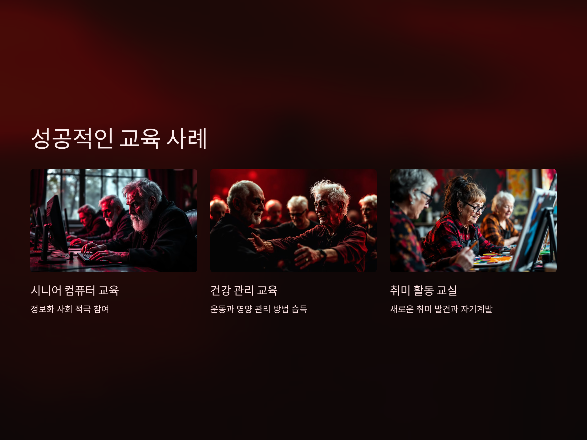 또한, "건강 관리 교육" 프로그램을 통해 고령자들이 운동과 영양에 대해 배우며, 자신의 건강을 더욱 잘 관리하는 방법을 익혔습니다. 이런 교육을 통해 고령자들은 체력과 정신 건강을 동시에 챙길 수 있었고, 노후를 더욱 행복하게 보낼 수 있었습니다.