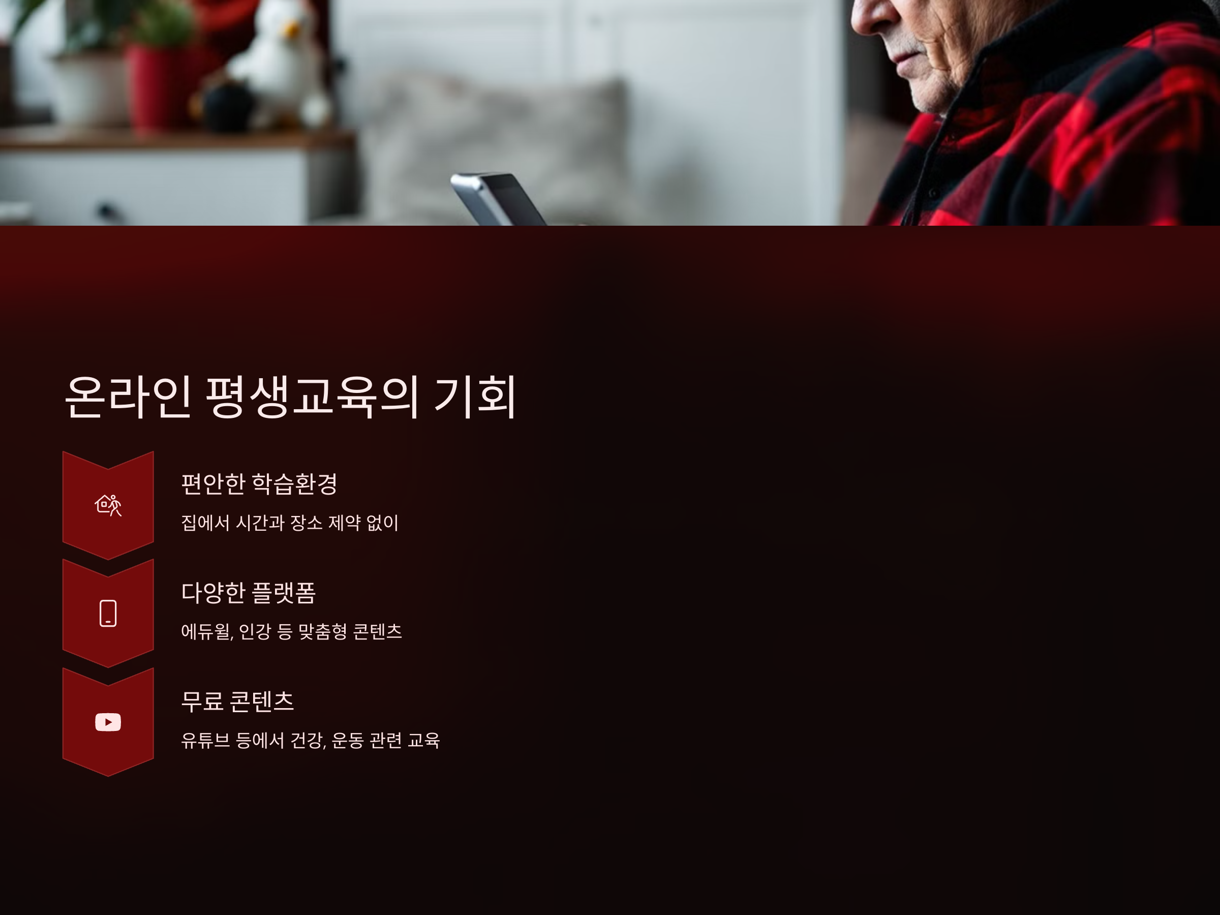 온라인 학습의 발전으로 인해, 고령자들은 집에서 편안하게 다양한 교육을 받을 수 있는 기회를 가지게 되었습니다. 온라인 강의는 시간과 장소에 구애받지 않으며, 고령자들이 더 많은 교육에 접근할 수 있도록 도와줍니다. 특히, 스마트폰이나 컴퓨터 사용이 익숙한 고령자들에게는 온라인 강좌가 매우 유용한 방법입니다.