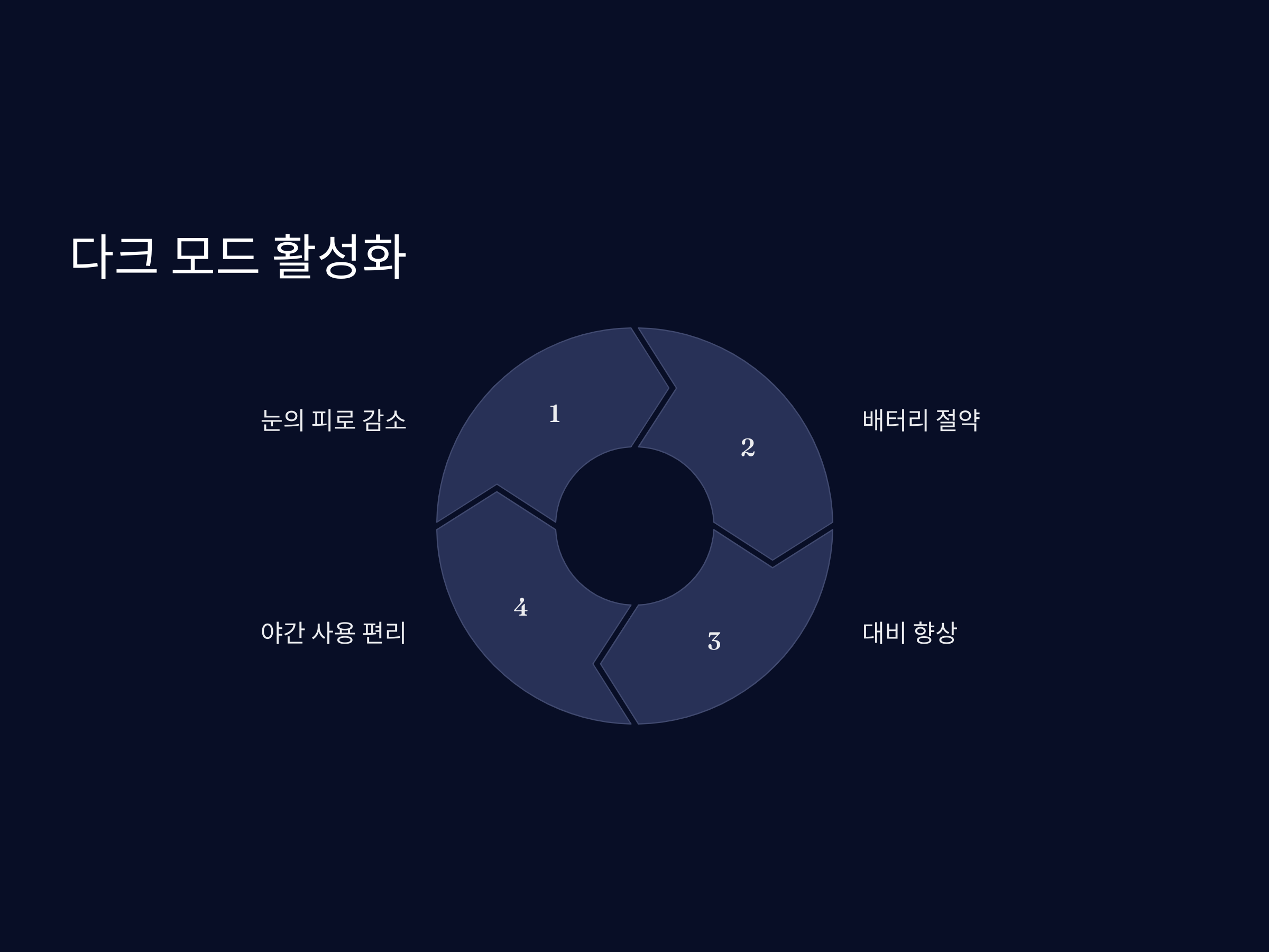 배경이 어두운 '다크 모드'는 밝은 화면보다 눈의 피로를 덜어줍니다. 스마트폰에서 다크 모드를 활성화하면 글자와 배경이 더 대비되어 눈의 부담이 줄어듭니다.