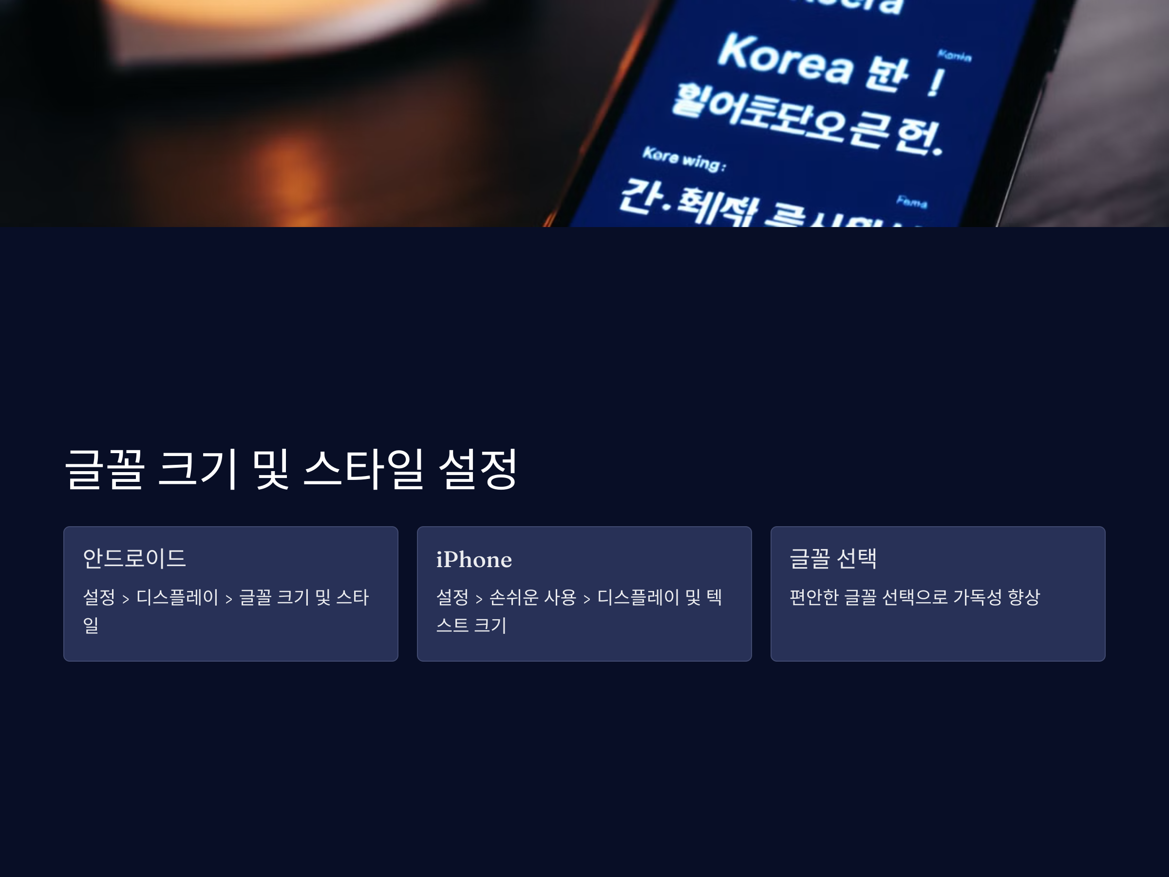 글씨를 크게 설정하는 것 외에도, 글꼴 크기나 스타일을 조정하는 방법도 있습니다. 텍스트를 읽기 쉽게 하기 위해 크기와 스타일을 조정하면 눈의 피로를 줄이고, 스마트폰을 사용할 때 더 편안해질 수 있습니다.