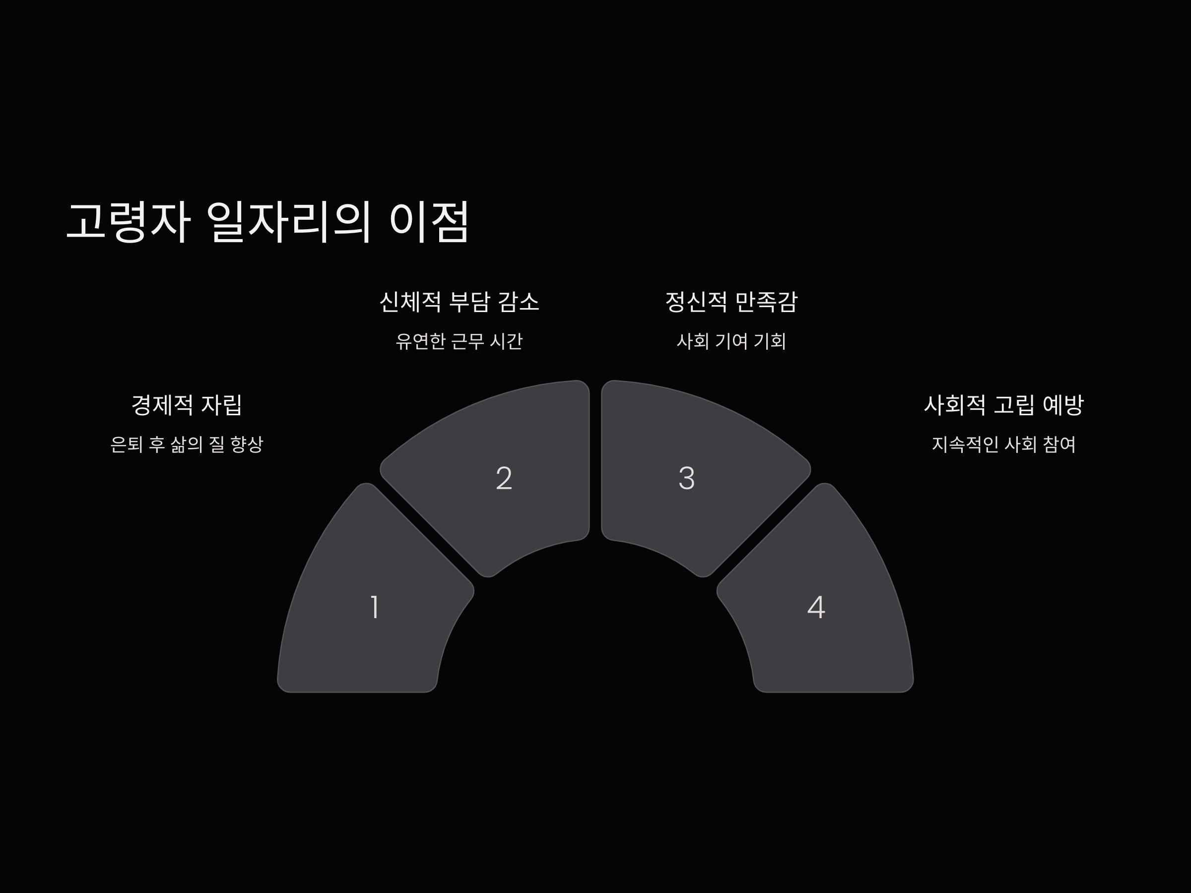 고령자 친화형 일자리는 여러 가지 이점을 제공합니다. 첫째, 고령자들이 일하면서 얻는 경제적 자립은 은퇴 후에도 삶의 질을 높이는 중요한 요소입니다. 둘째, 신체적으로 부담이 적고, 유연한 근무 시간으로 고령자들의 라이프스타일에 맞춘 직업을 찾을 수 있습니다. 셋째, 고령자들이 일하는 것은 정신적 만족감을 높이고, 사회적 고립을 예방하는 데 도움을 줍니다. 이는 고령자들이 자신의 경험과 지식을 나누며 사회에 기여할 수 있는 기회를 제공하기 때문에, 삶에 대한 만족도를 크게 향상시킵니다.