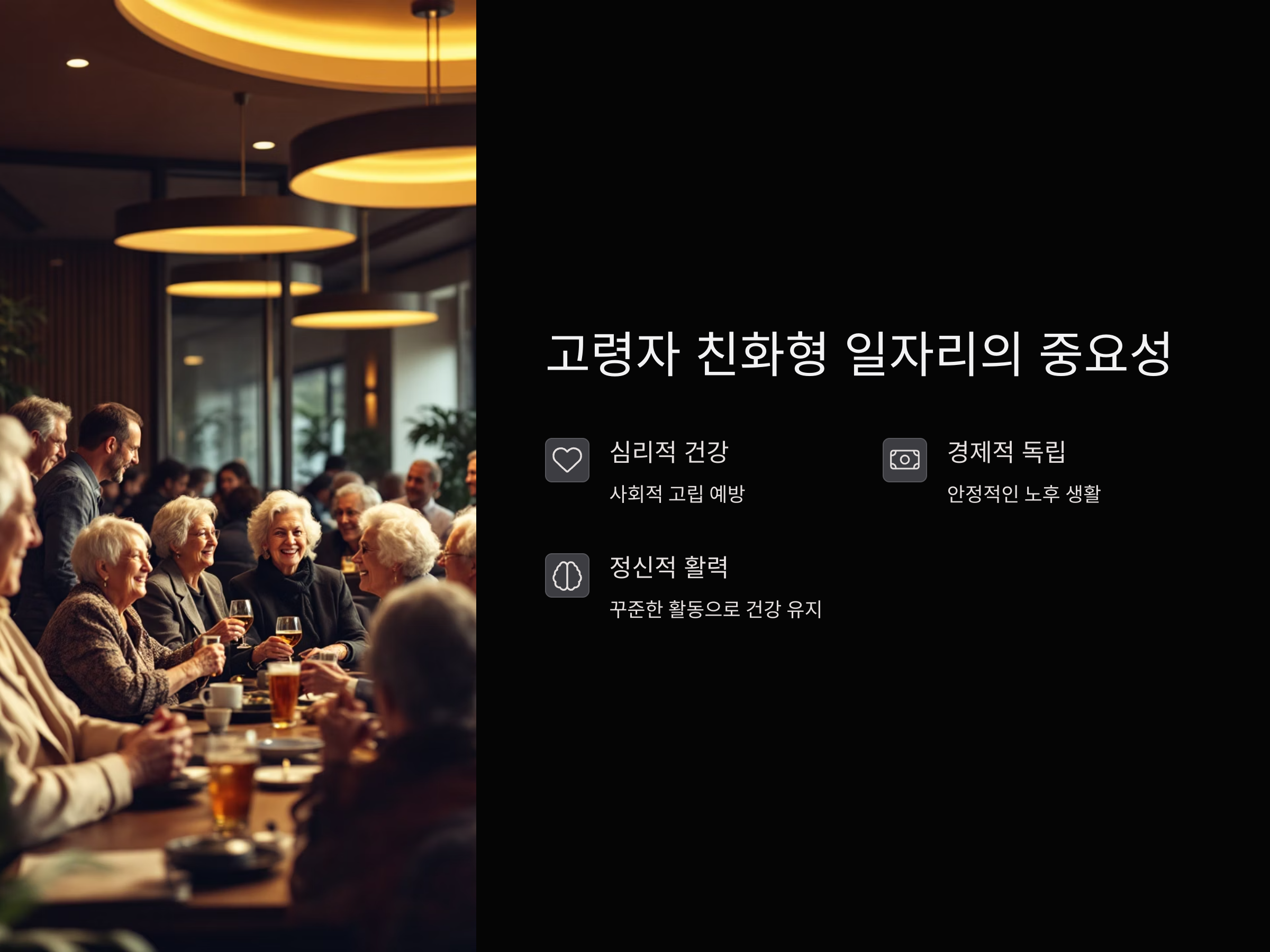 고령자 친화형 일자리는 단순히 신체적으로 힘이 덜 드는 직업만을 의미하지 않습니다. 이는 삶의 질을 높이는 데 중요한 역할을 합니다. 고령자들이 은퇴 후에도 계속해서 일하고 사회에 기여하는 것은 심리적, 경제적으로도 큰 도움이 됩니다. 그들은 적극적인 활동을 통해 사회적 고립을 예방하고, 꾸준한 일을 통해 정신적, 신체적 건강을 유지할 수 있습니다. 이런 관점에서 고령자 친화형 일자리는 매우 중요한 역할을 하고 있으며, 특히 경제적 독립을 원하는 고령자들에게 큰 도움이 됩니다.