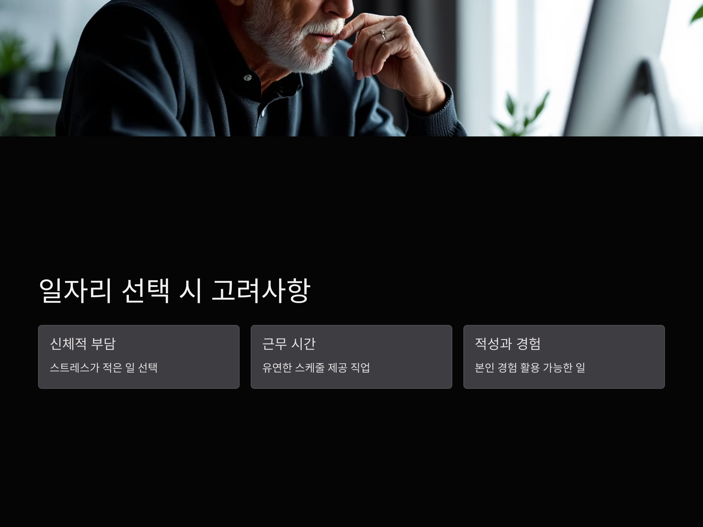 고령자들이 일자리를 구할 때는 몇 가지 중요한 사항을 고려해야 합니다. 첫째, 신체적으로 부담이 적고, 정신적으로 스트레스를 덜 받는 일을 선택해야 합니다. 둘째, 유연한 근무 시간을 제공하는 직업을 찾는 것이 중요합니다. 고령자들이 일하는 데 있어 중요한 점은 스스로 원하는 시간에 일할 수 있다는 점입니다. 셋째, 일의 성격이 고령자의 경험과 적성에 맞는지를 고려하는 것이 좋습니다. 너무 복잡하거나 기술적인 작업보다는 본인의 경험을 충분히 활용할 수 있는 일을 찾는 것이 더 나은 선택이 될 수 있습니다.