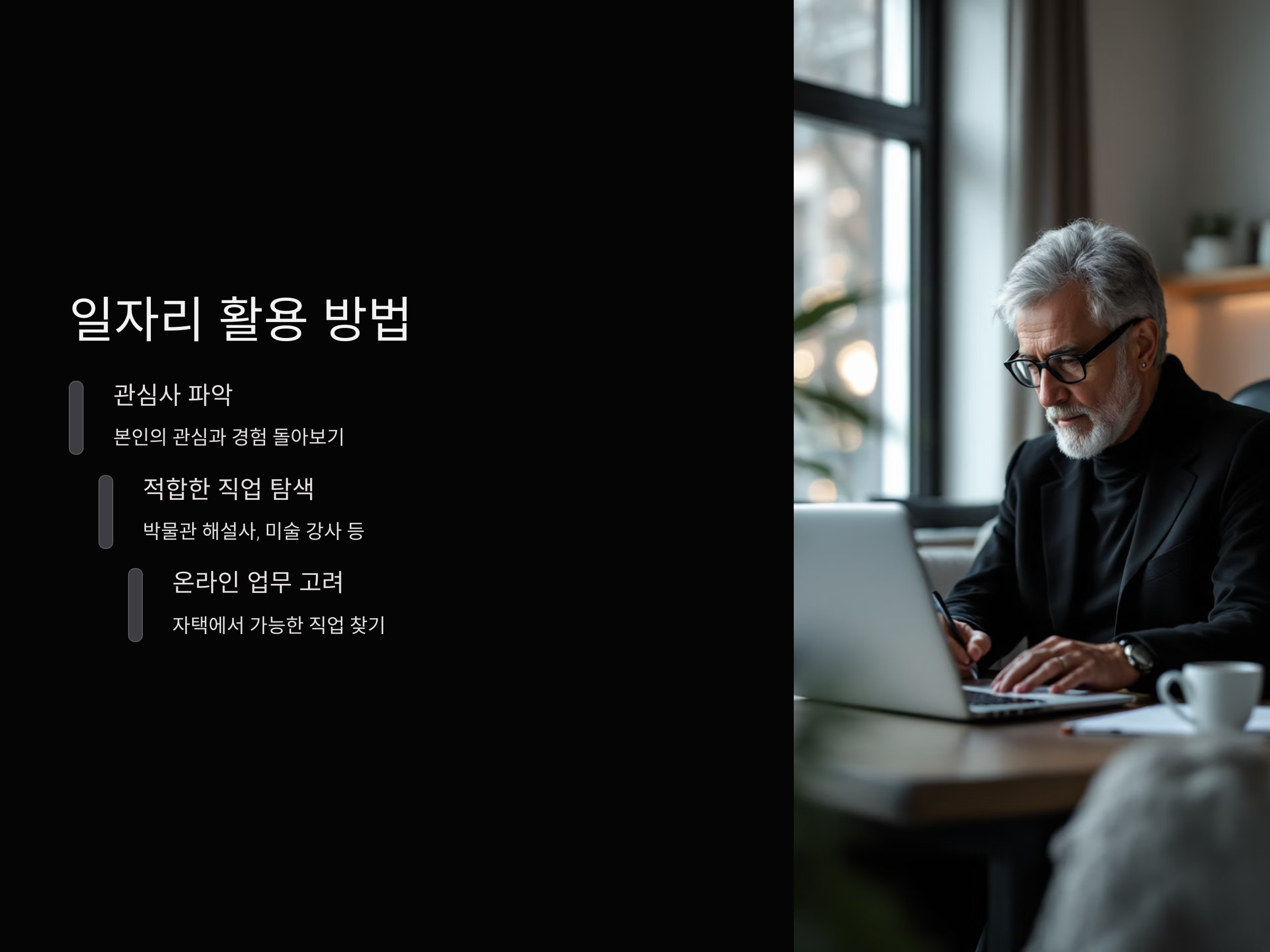 고령자 친화형 일자리를 활용하는 데 있어 중요한 점은 자신에게 맞는 직업을 찾는 것입니다. 이를 위해서는 먼저 본인의 관심사와 경험을 돌아보고, 그에 맞는 직업군을 찾아야 합니다. 예를 들어, 예술이나 역사에 관심이 많은 고령자는 박물관 해설사나 미술 강사로 활동할 수 있습니다. 또한, 온라인 업무나 자택에서 할 수 있는 직업은 이동이 불편하거나 외출이 어려운 고령자에게 적합할 수 있습니다. 이를 통해 보다 적극적으로 자신에게 맞는 직업을 찾고, 은퇴 후에도 사회적 참여와 경제적 자립을 지속할 수 있습니다.