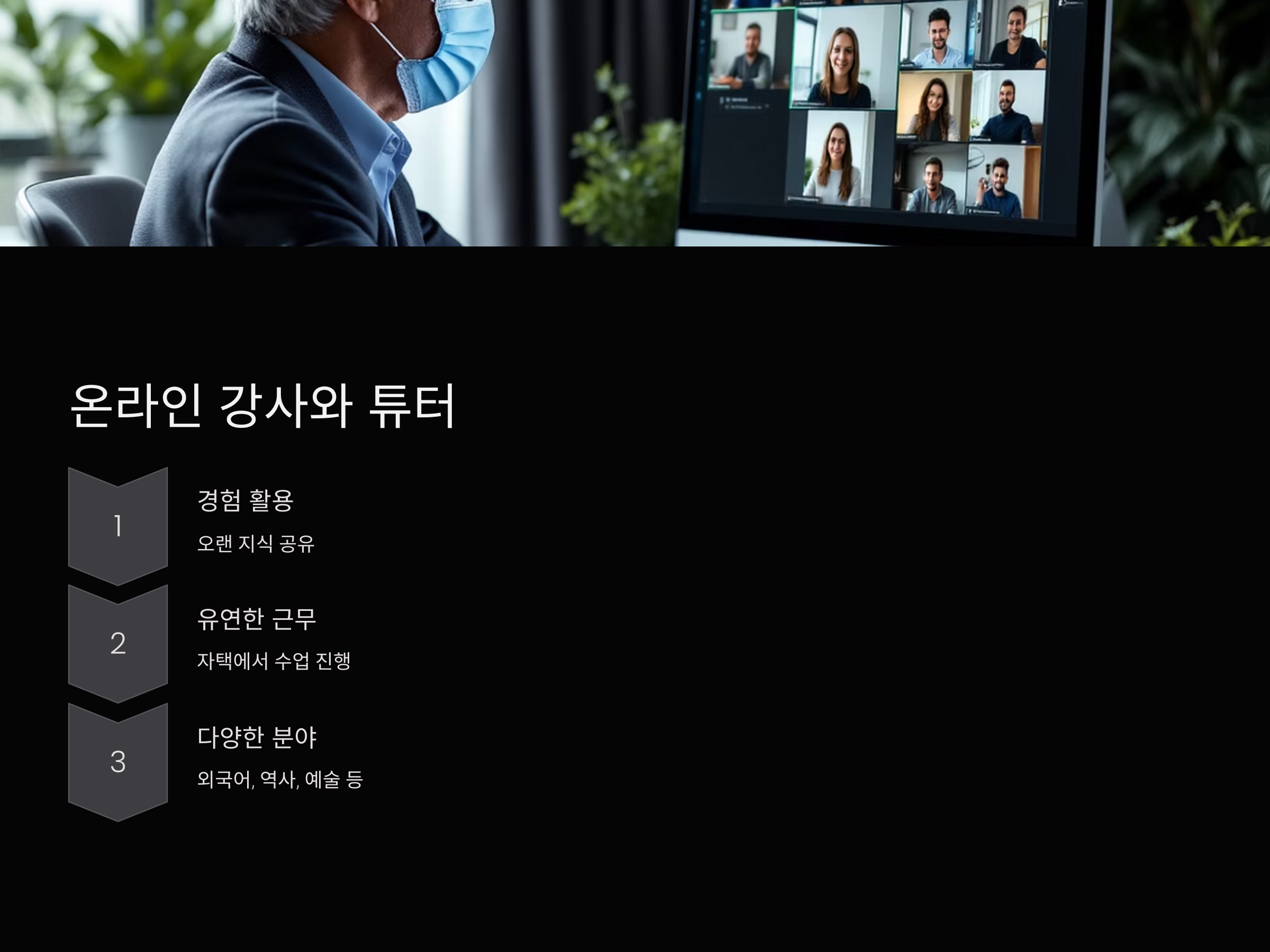 고령자들이 자신의 경험과 지식을 활용하여 온라인에서 강사나 튜터로 활동하는 것은 매우 적합한 일자리입니다. 고령자들은 특정 분야에서 오랜 경험을 가지고 있으므로, 이를 바탕으로 다양한 주제에 대해 가르칠 수 있습니다. 특히 외국어, 역사, 예술 등의 분야에서 수요가 많습니다. 온라인 플랫폼을 통해 자택에서 유연하게 수업을 진행할 수 있어 많은 장점이 있습니다.