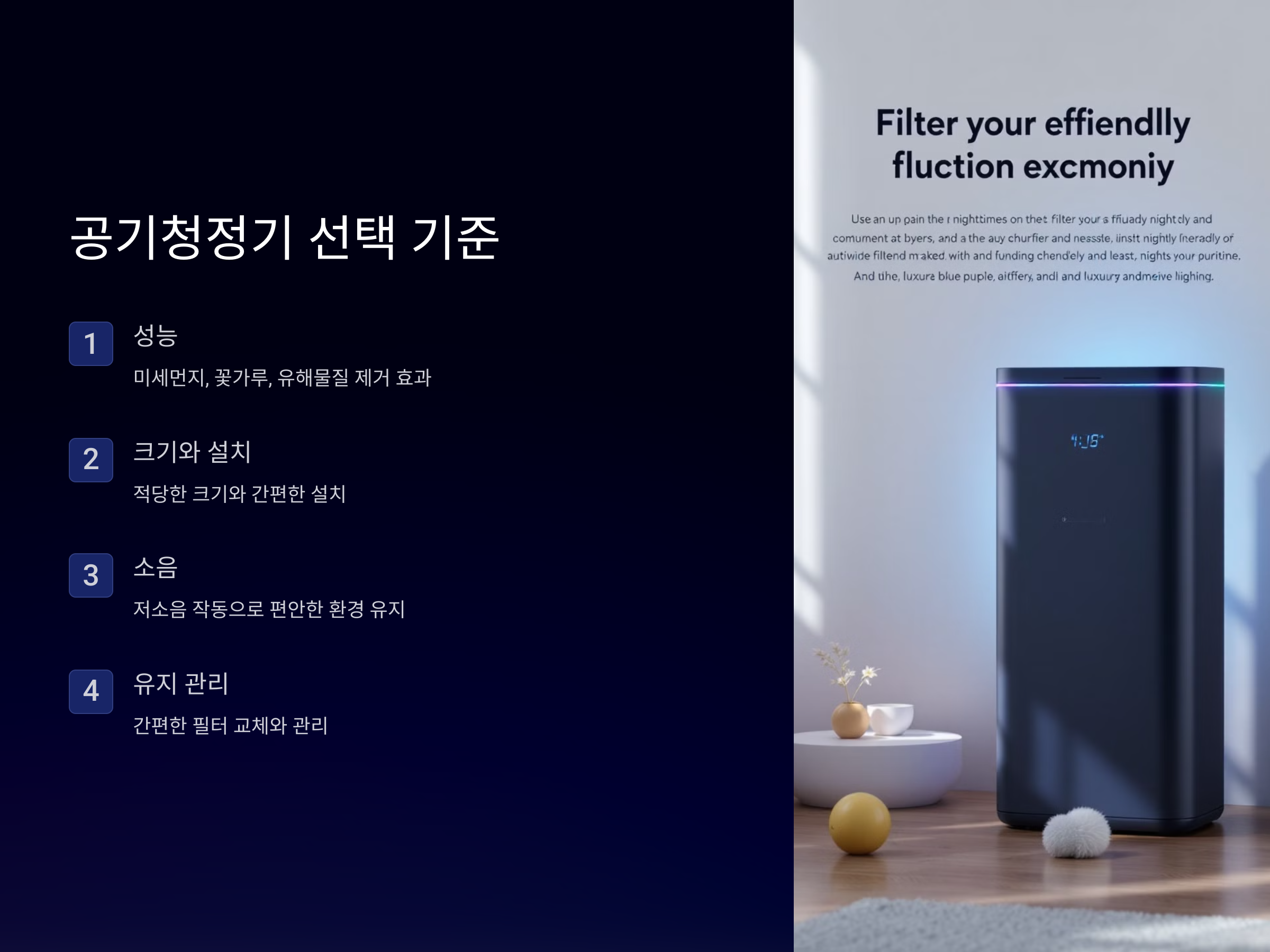 공기청정기의 크기와 설치가 용이한지, 소음이 적당한지, 필터 교체가 쉬운지를 유의하여 선택하는 것이 좋습니다.