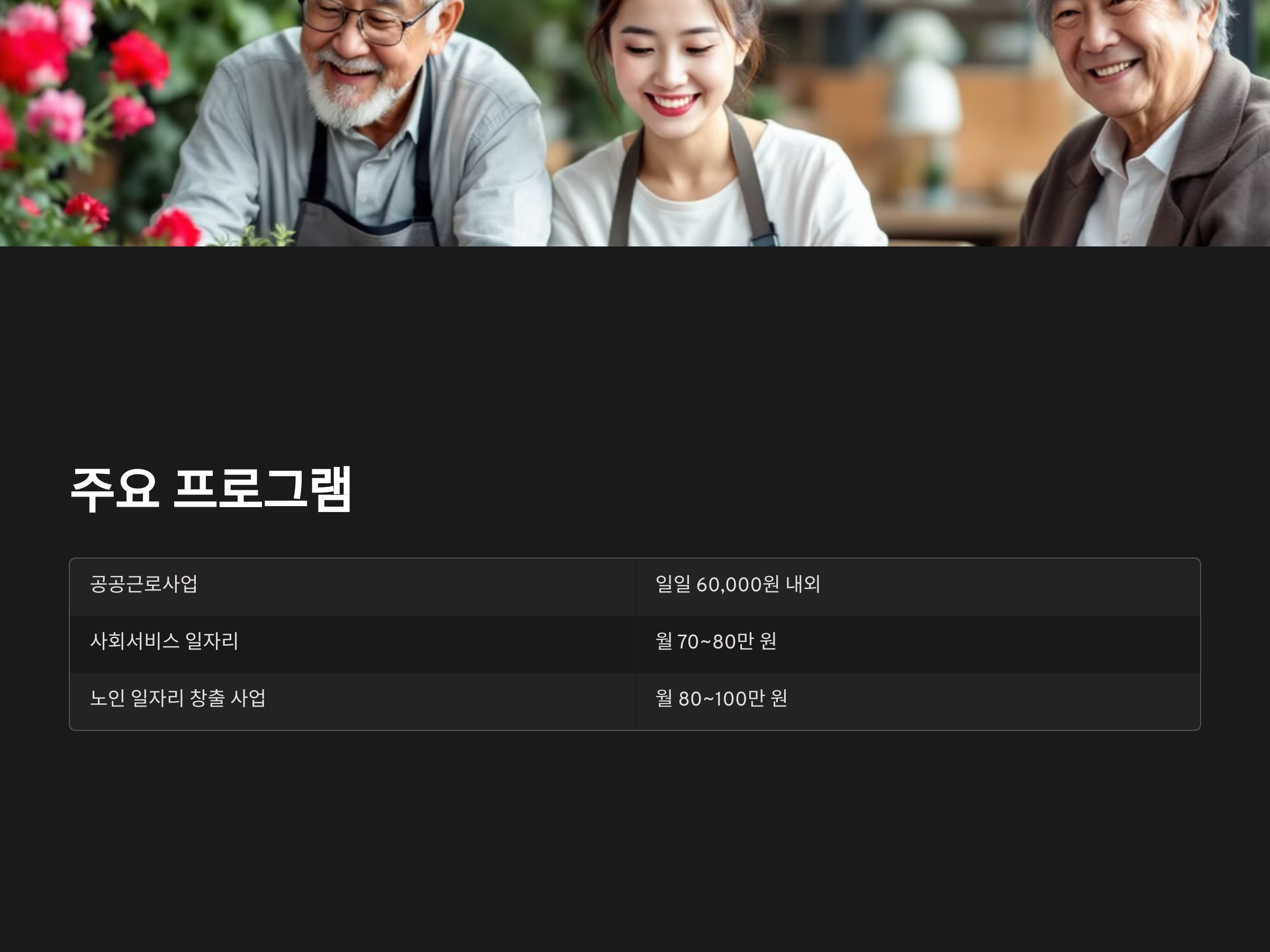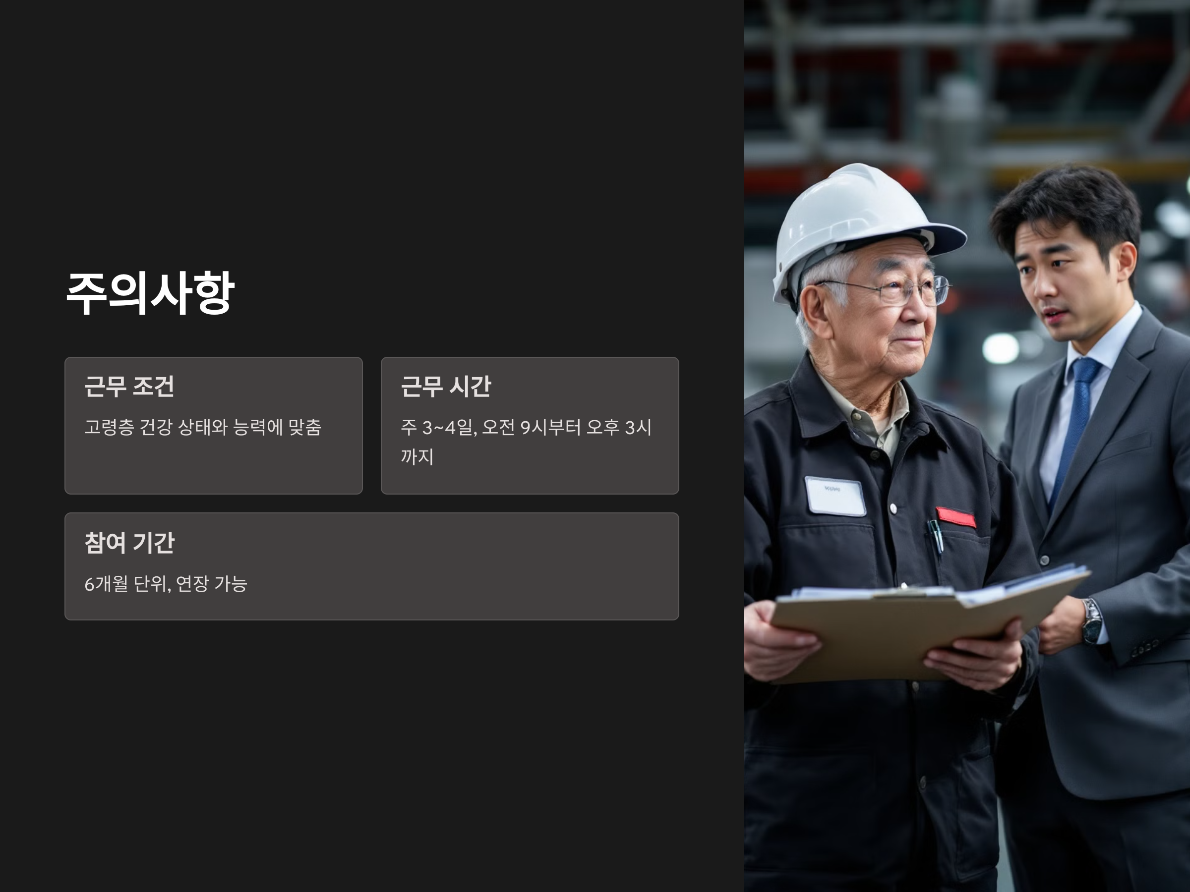 - 일자리의 내용은 기본적으로 고령층의 건강 상태와 능력에 맞추어 배정되며, 과도한 체력 소모를 요구하는 일은 피하게 됩니다.