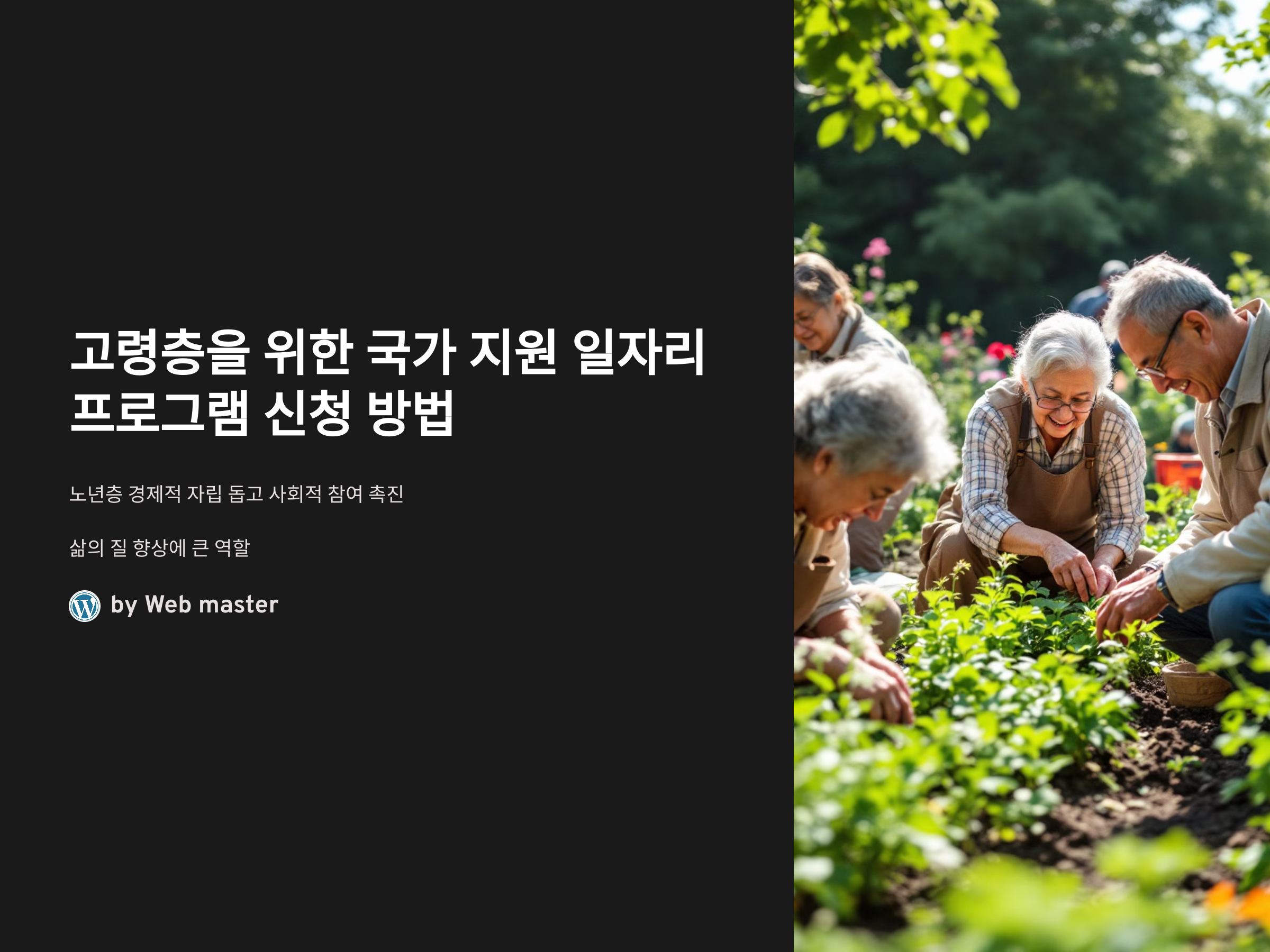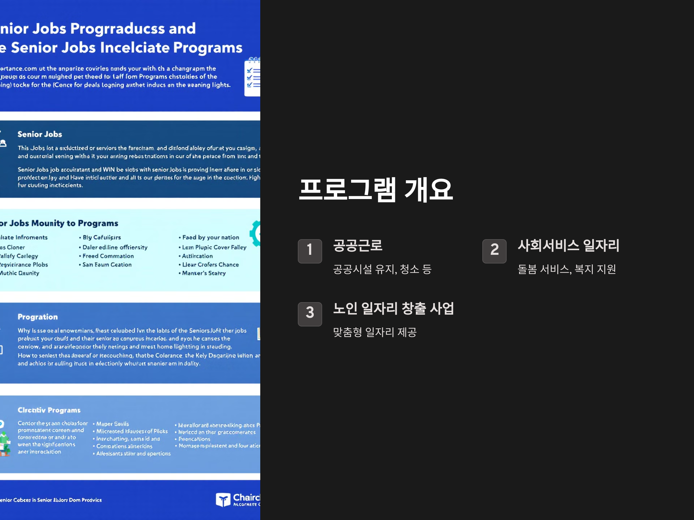 - 목표: 고령층의 특성을 고려한 맞춤형 일자리를 창출하여 사회적 참여를 유도합니다.