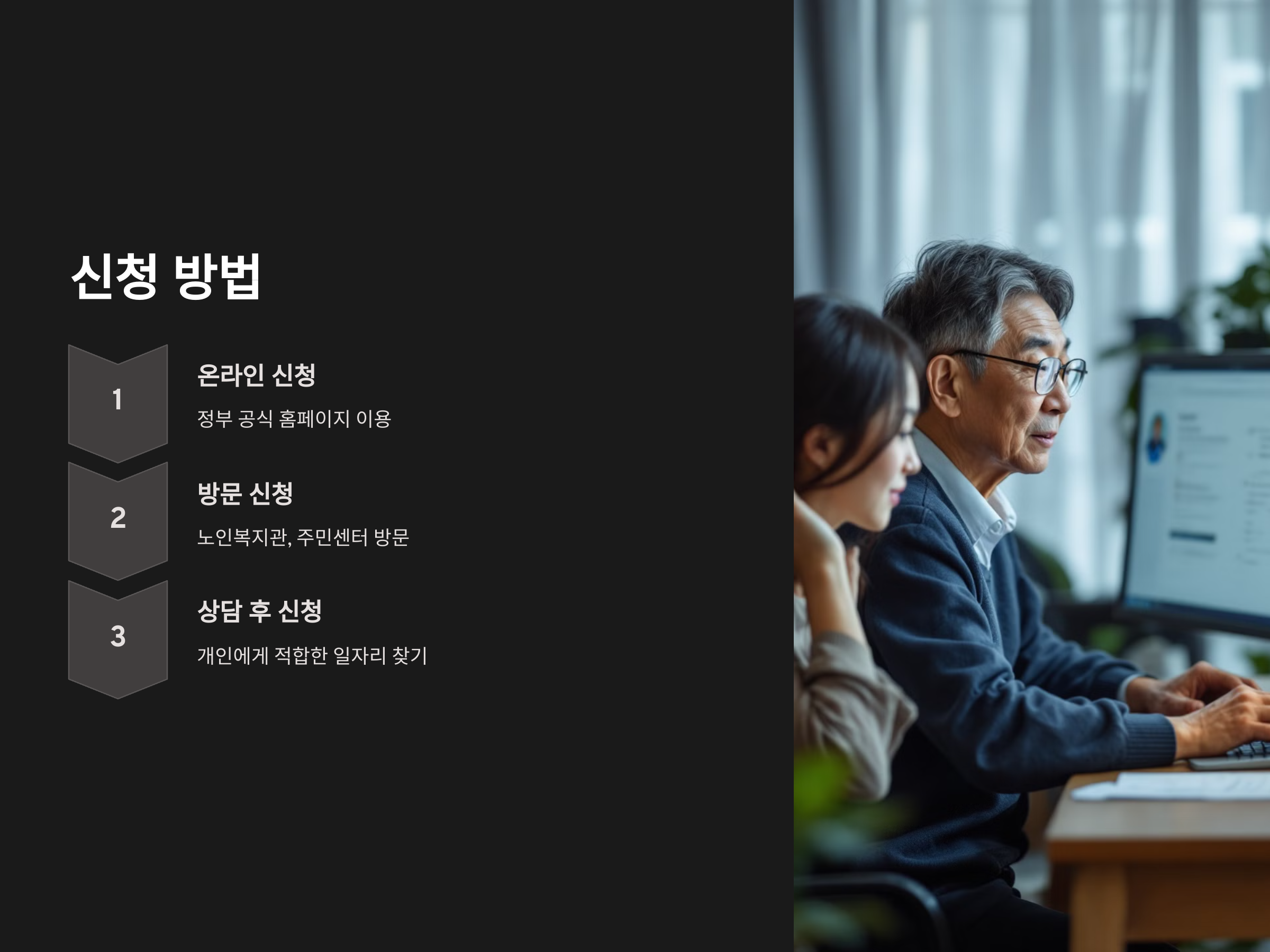 - 일부 고령층 일자리 프로그램은 상담 후 신청을 받으며, 이를 통해 개인에게 적합한 일자리를 찾는 과정이 포함될 수 있습니다.