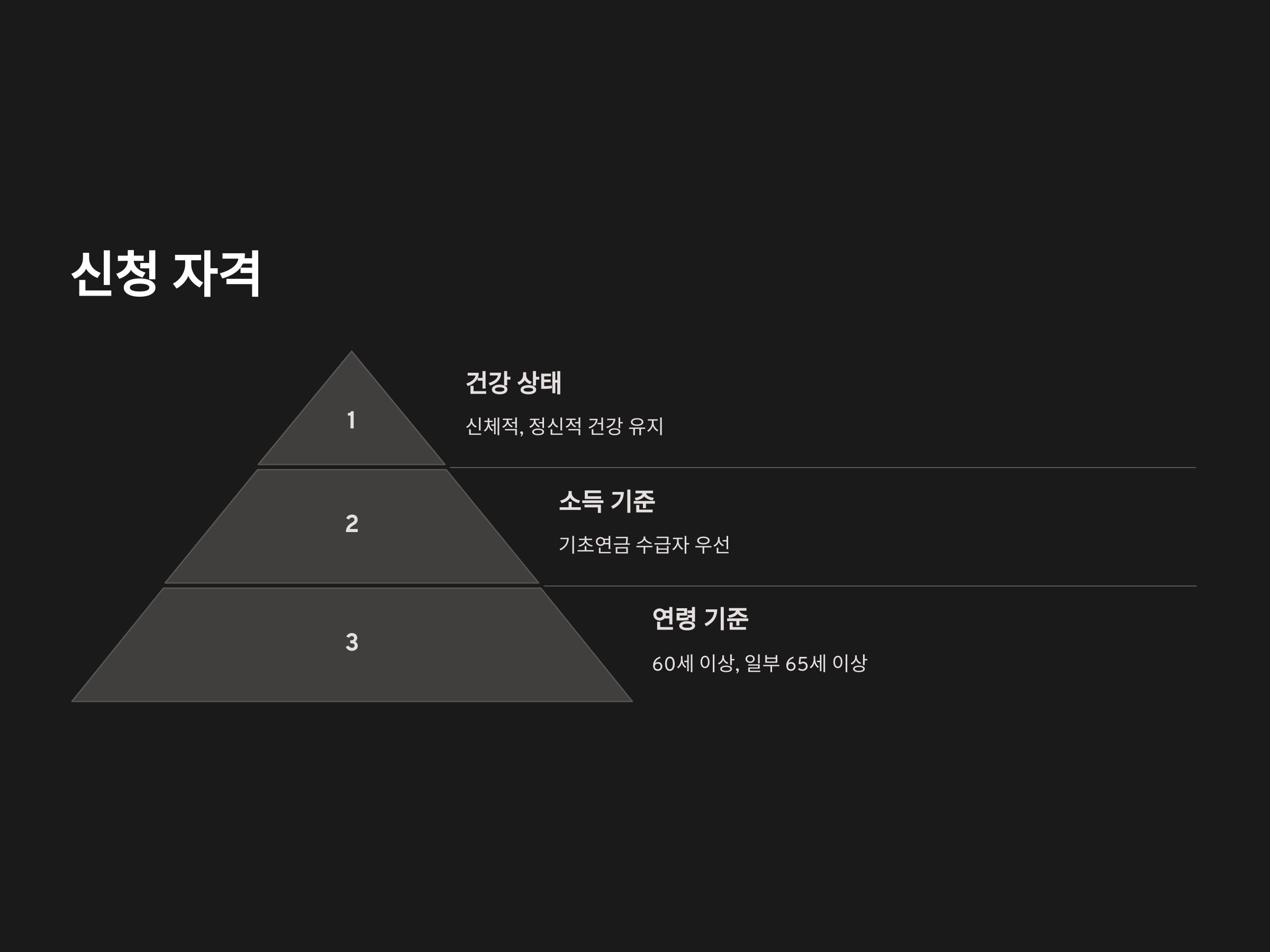- 소득 기준: 기초연금 수급자 또는 소득이 낮은 고령층에게 우선적으로 제공됩니다.