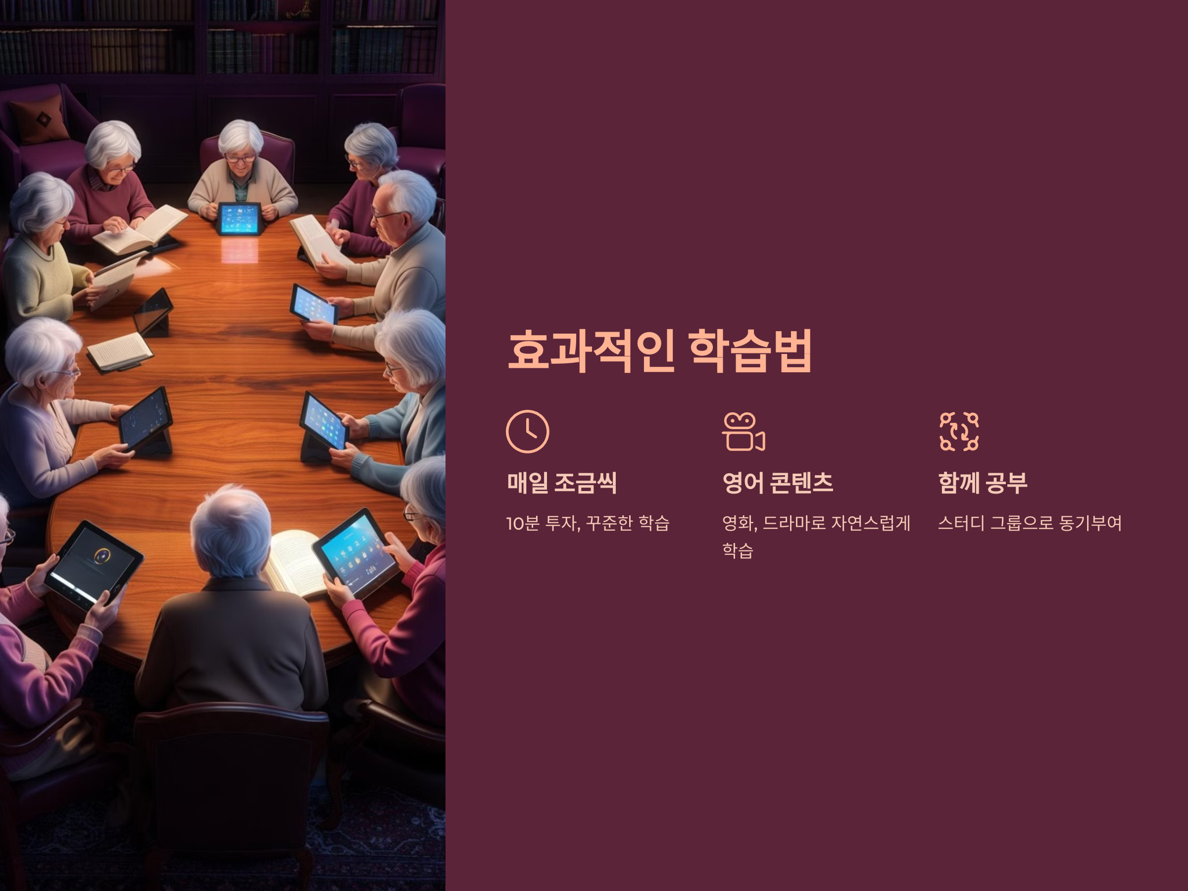 고령층이 영어를 효과적으로 배우기 위해서는 꾸준한 학습이 필요하지만, 재미와 동기를 유지하는 것이 중요합니다. 학습에 부담을 느끼지 않도록 하고, 성취감을 얻을 수 있도록 다양한 방법을 활용하는 것이 좋습니다.