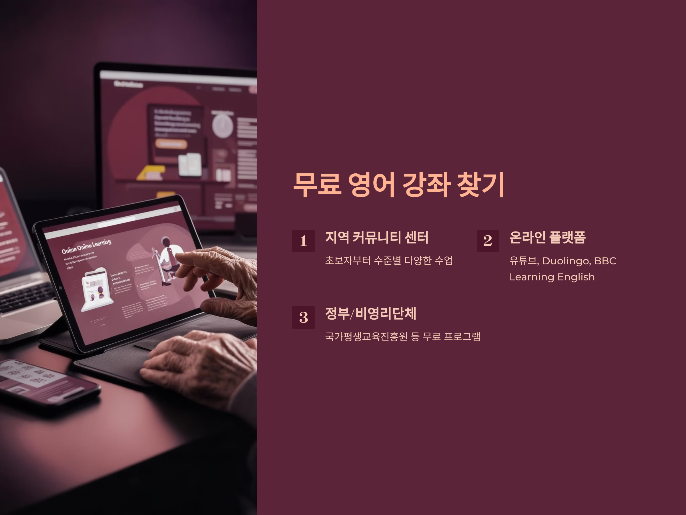 고령층을 위한 영어 강좌는 대부분 무료로 제공됩니다. 무료 강좌는 지역 커뮤니티 센터, 도서관, 온라인 플랫폼 등에서 쉽게 찾을 수 있습니다. 이러한 강좌들은 고령층이 쉽게 접근할 수 있도록 구성되어 있으며, 학습의 부담을 줄여줍니다.